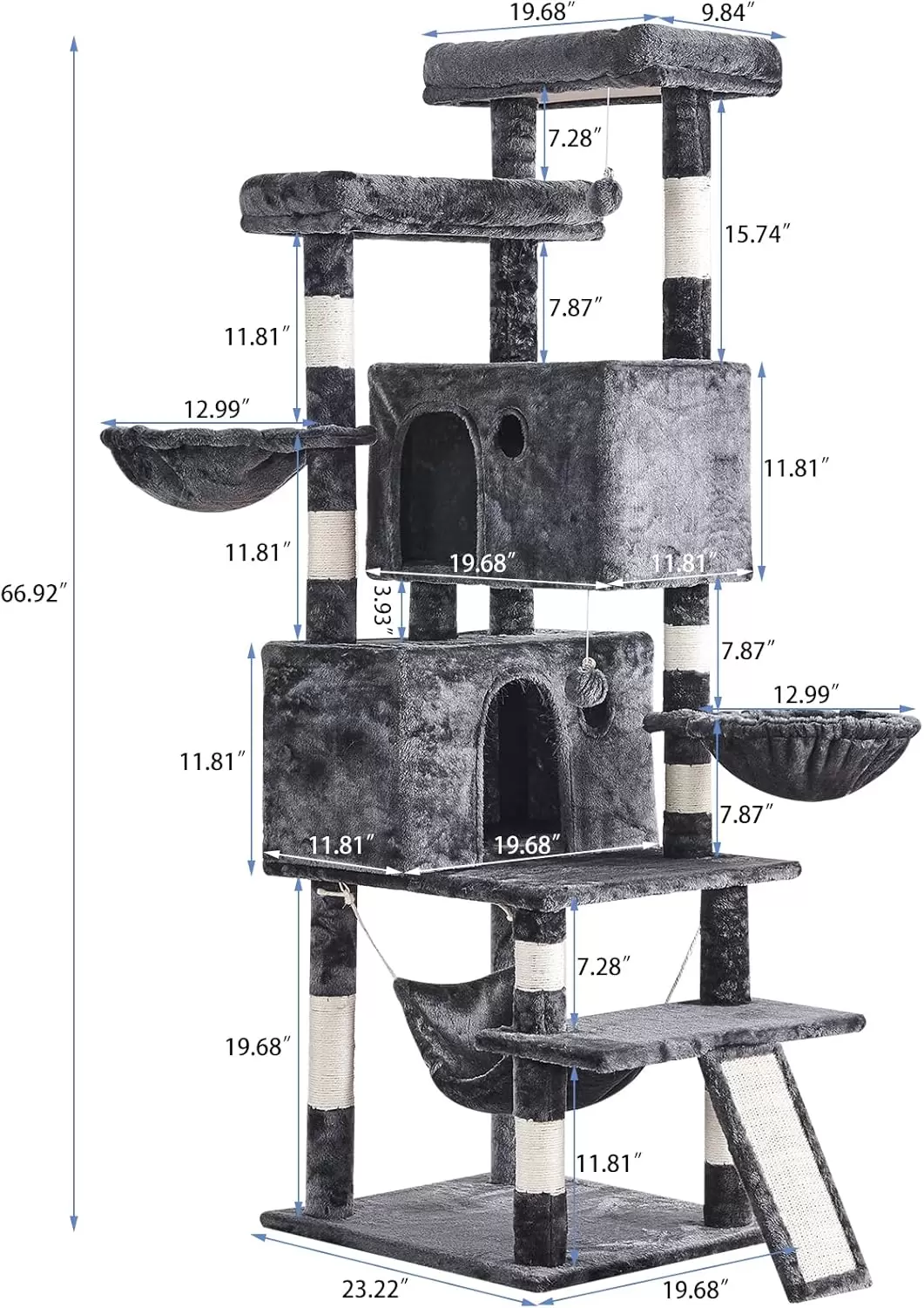 Seguridad y Estabilidad Robusta: Base Ampliada: Los muebles estan soportados por postes resistentes y una base ampliada (59 por 50 centimetros) para evitar balanceos o vuelcos. Kit Anti-Vuelco Incluido: El arbol viene con un kit anti-puntas para una seguridad reforzada, dandole total tranquilidad.