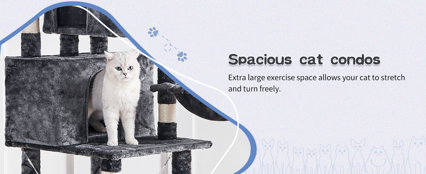 Capacidad y Refugios de Lujo: Condominios Dobles: Diseñado con dos amplios condominios (50 por 30 centimetros) que ofrecen un escondite privado, protegiendo a los gatos del mundo exterior. 4 Zonas de Descanso: La torre ofrece varios espacios adicionales: dos camas de canasta, un condominio y una hamaca, satisfaciendo la necesidad de acurrucarse.