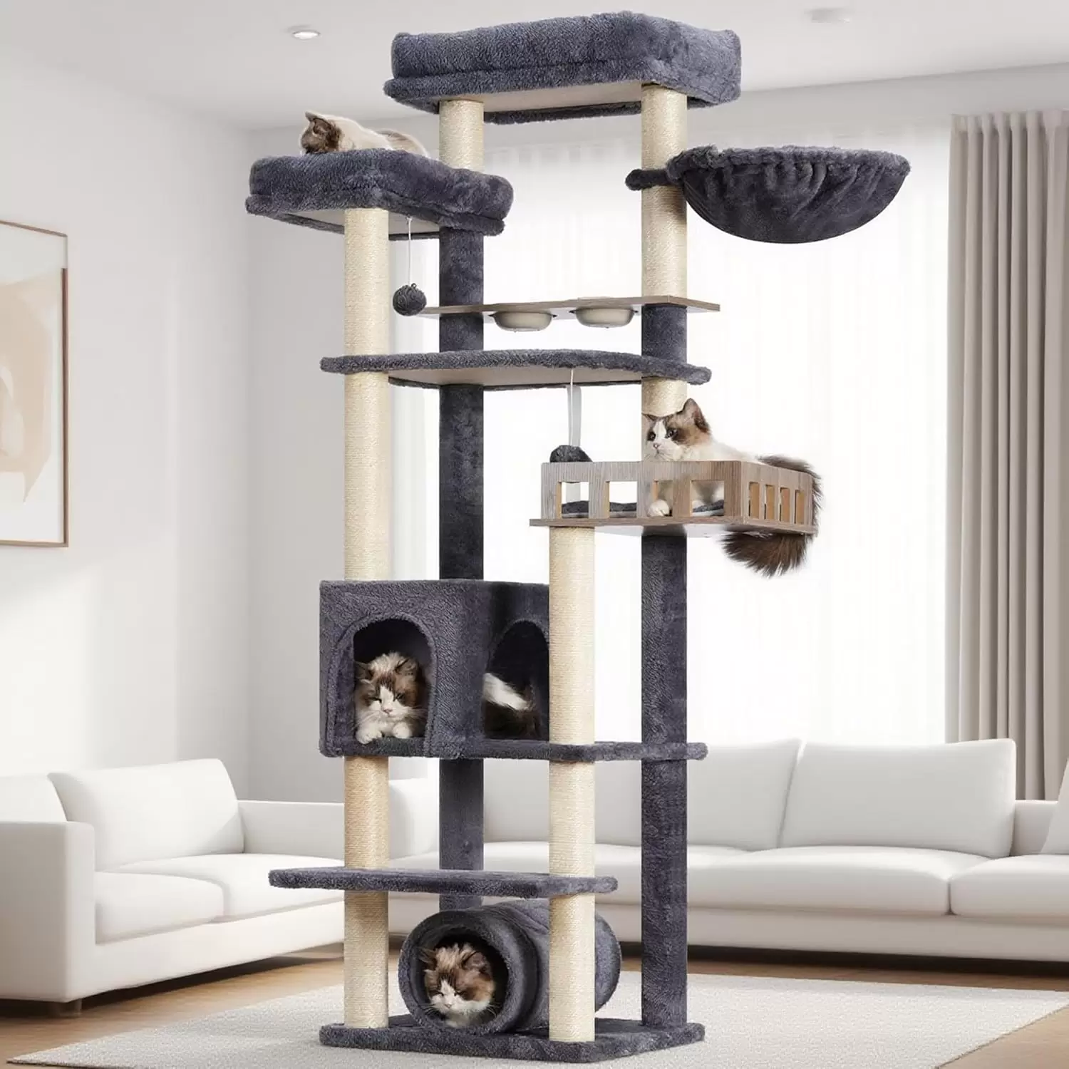 Torre rascador alta (167 cm) con estación de alimentación y túnel. Sisal completo, condominio y correa anti-vuelco. Ideal para descanso y juego seguro.
