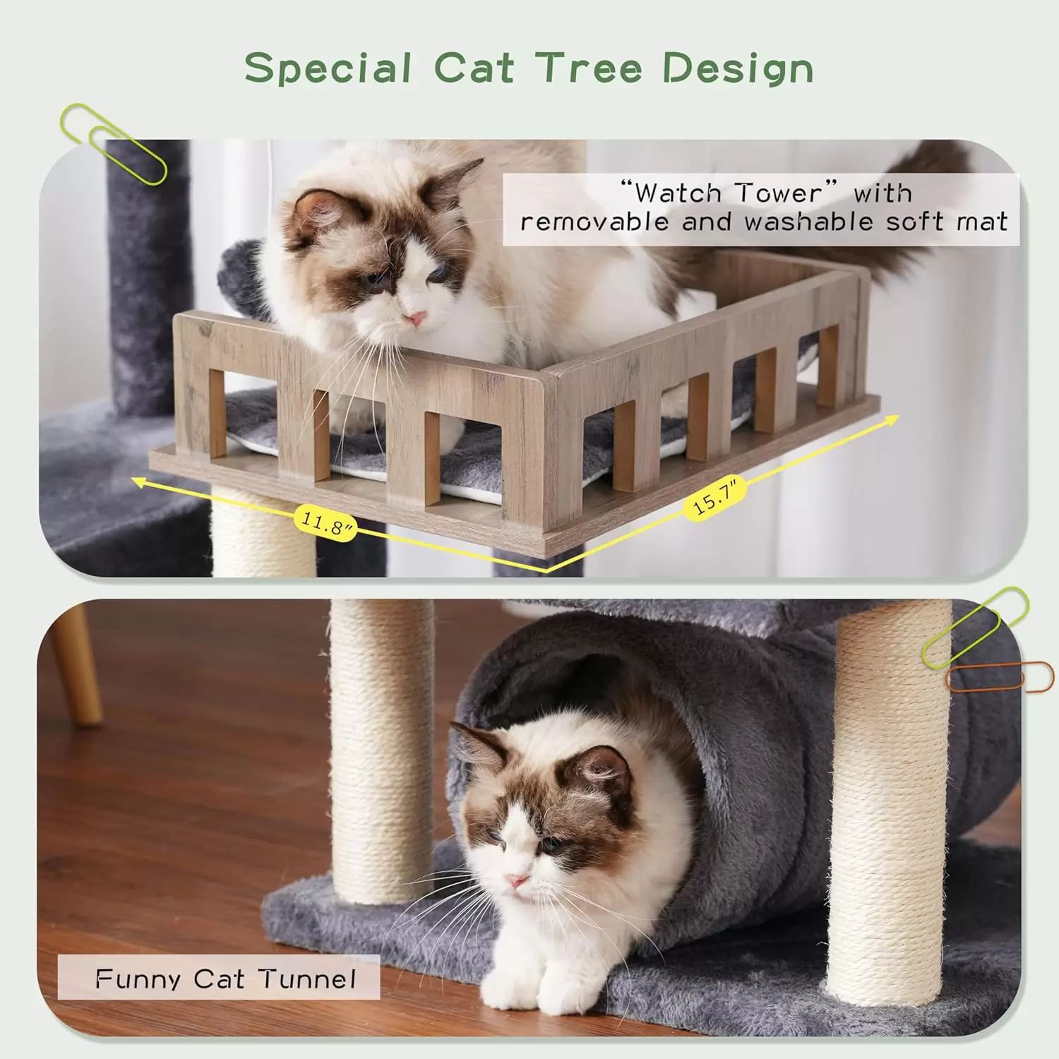 Funcionalidad Unica y “Mundo Gourmet”: Estacion de Alimentacion: La plataforma de alimentacion es el “pequeño mundo gourmet” para que sus gatos puedan comer y beber tranquilamente, evitando que otras mascotas lleguen a su comida. Torre del Reloj: La plataforma grande superior (48 por 30 centimetros) sirve como la exclusiva “Torre del Reloj”, permitiendo a los gatos observar su territorio como pequeños reyes. Tunel y Movimiento: El tunel en la parte inferior permite a los gatos entrar y salir facilmente, fomentando el juego.