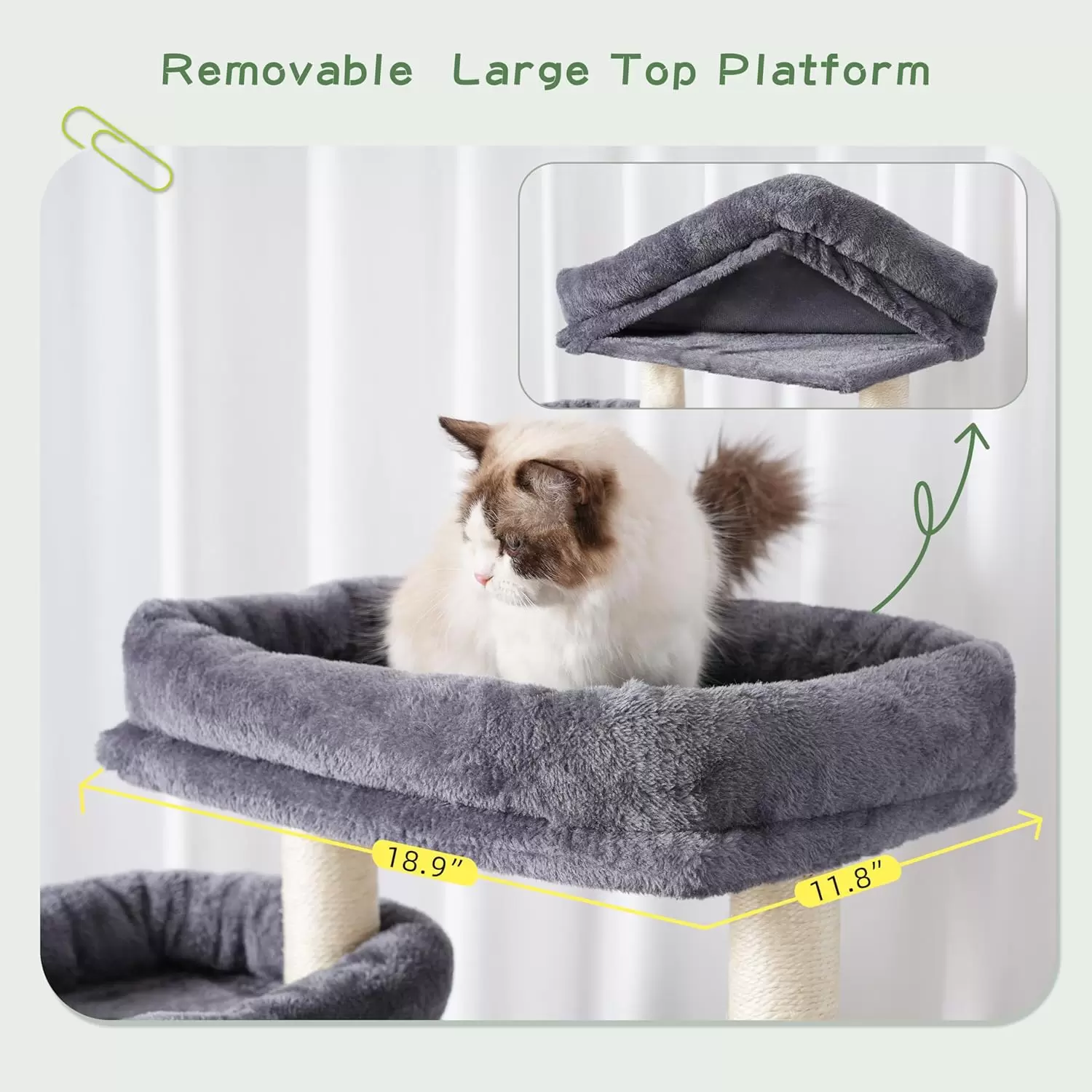Este arbol alto para gatos es un centro de actividades integral con un diseño inteligente que maximiza la comodidad y la diversion de su mascota.