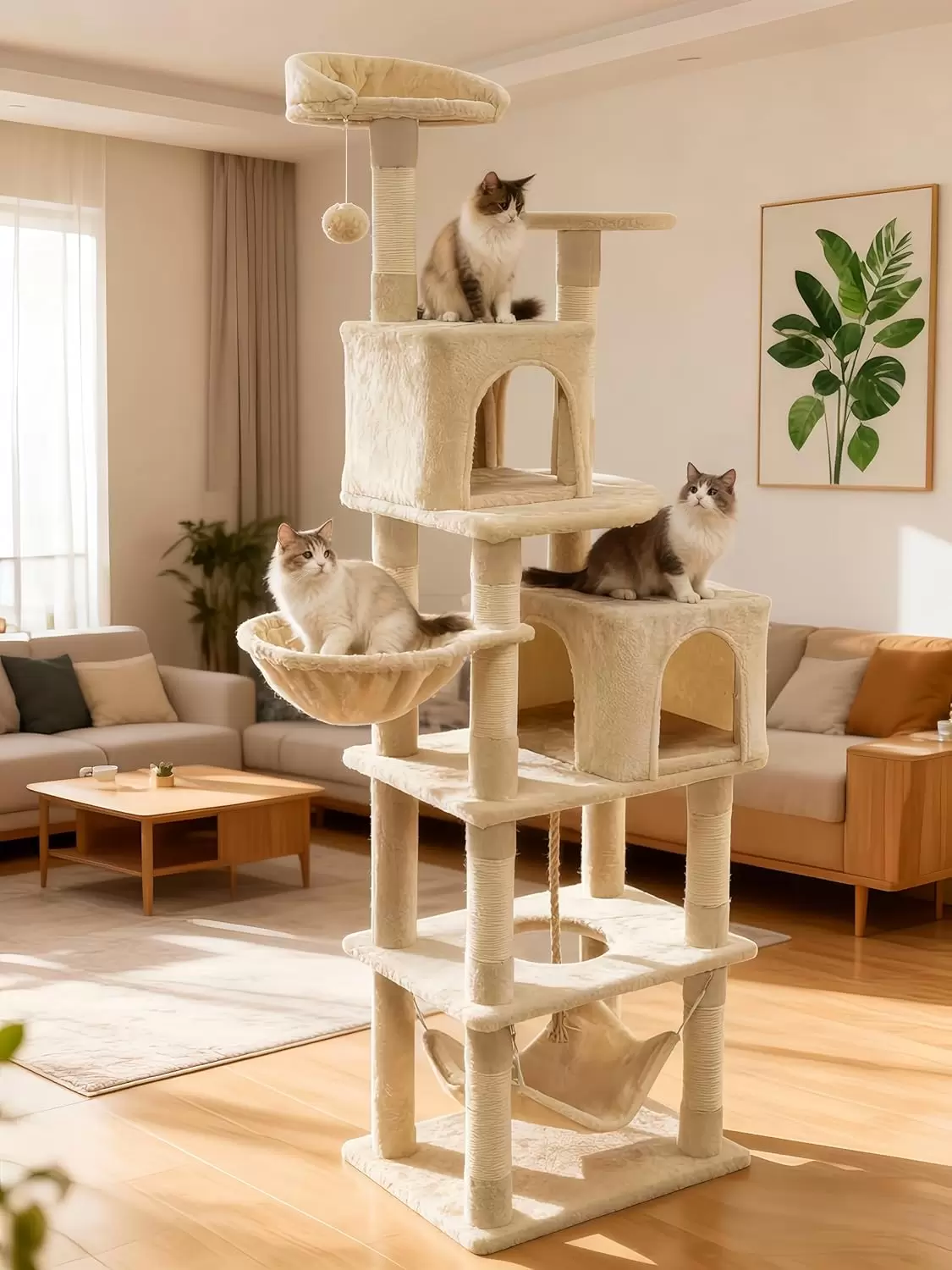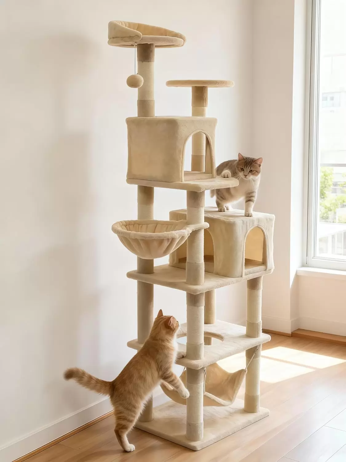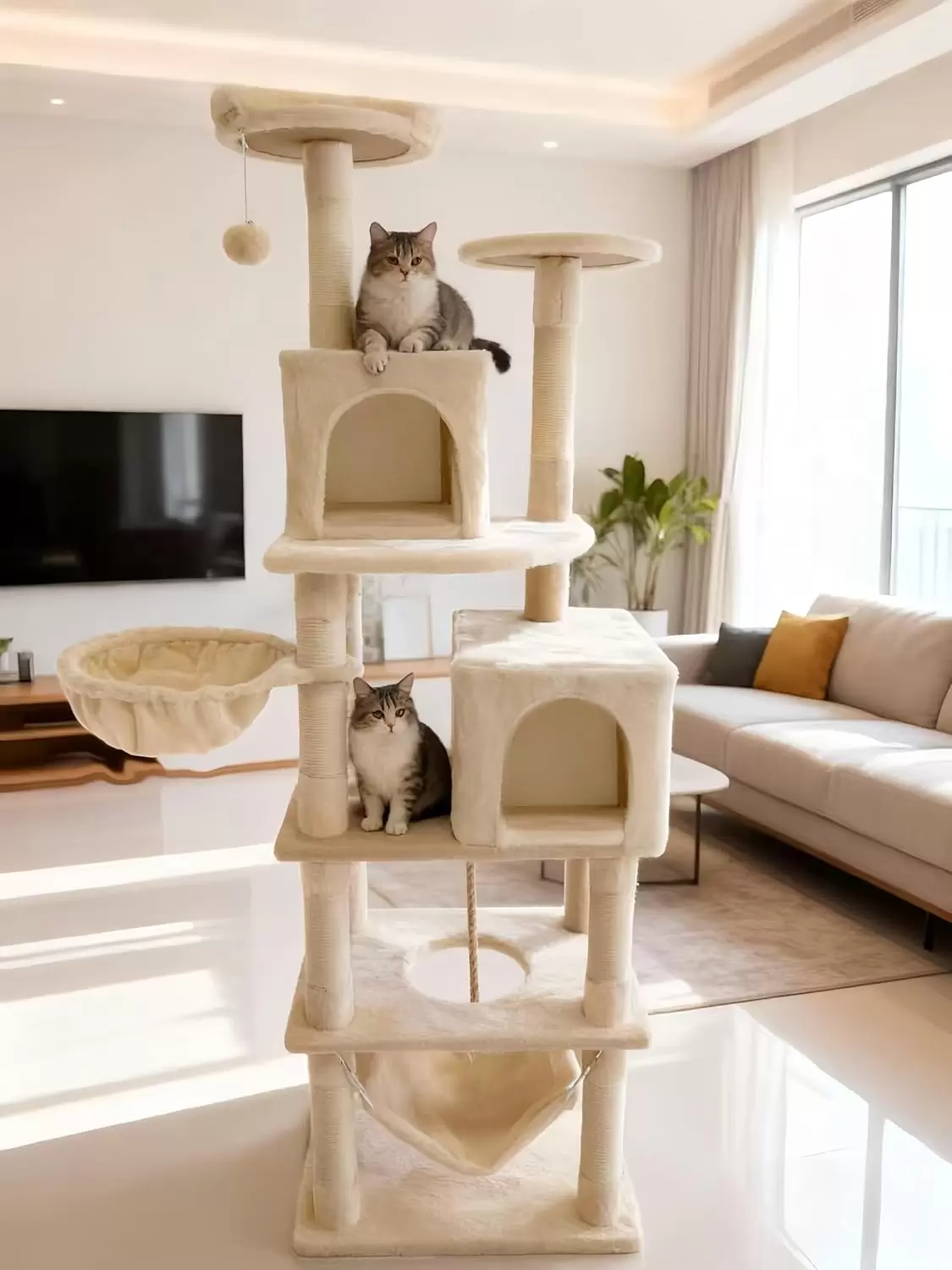 Este arbol para gatos de varios niveles esta diseñado para satisfacer los instintos naturales y las necesidades de actividad de su felino, ofreciendo un centro de entretenimiento completo en casa.