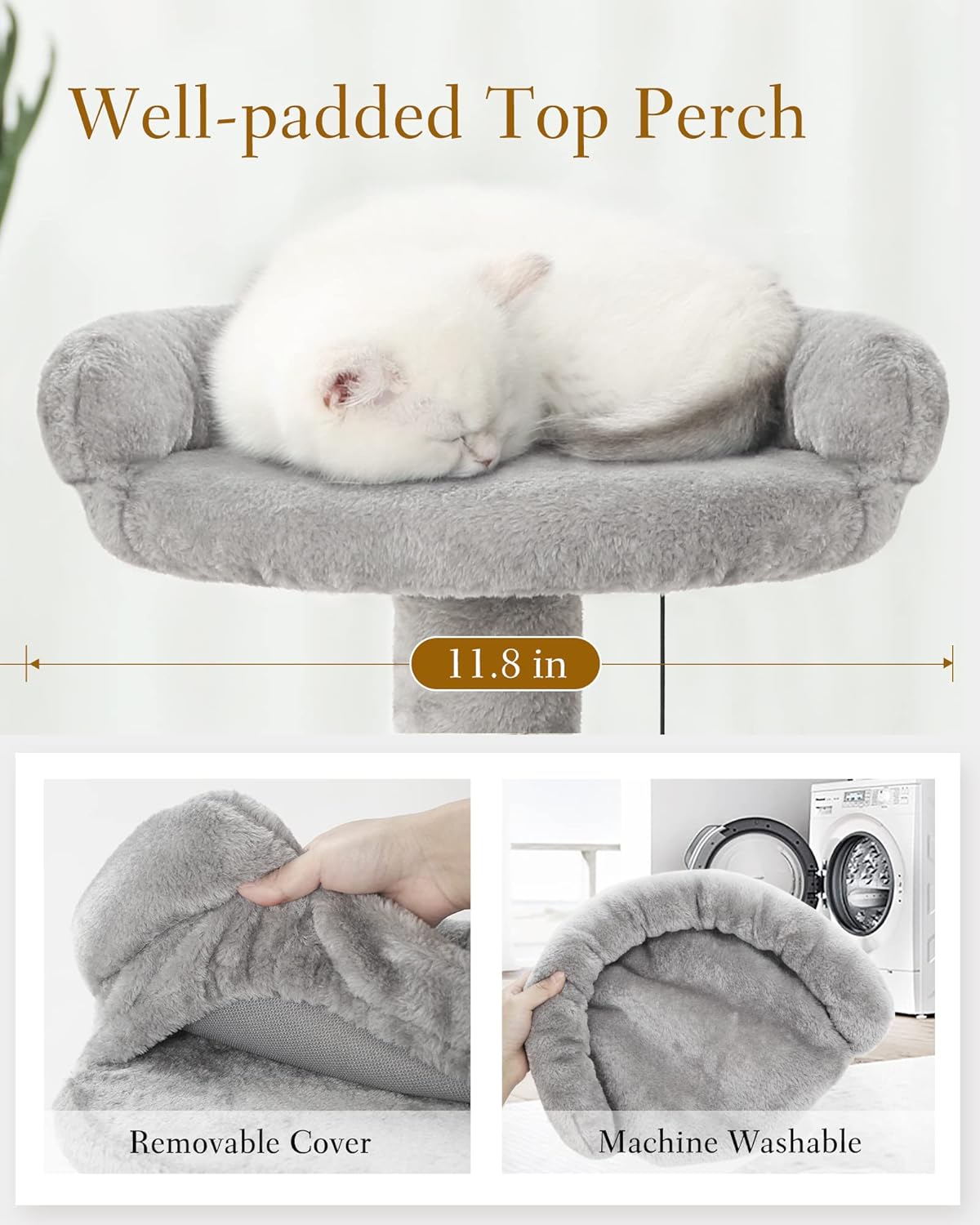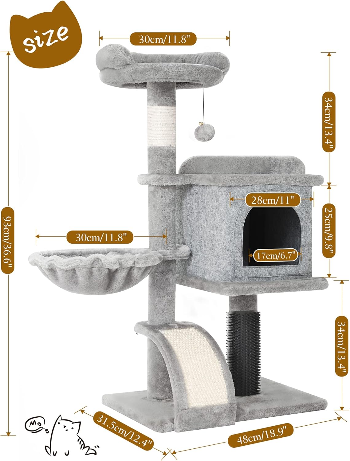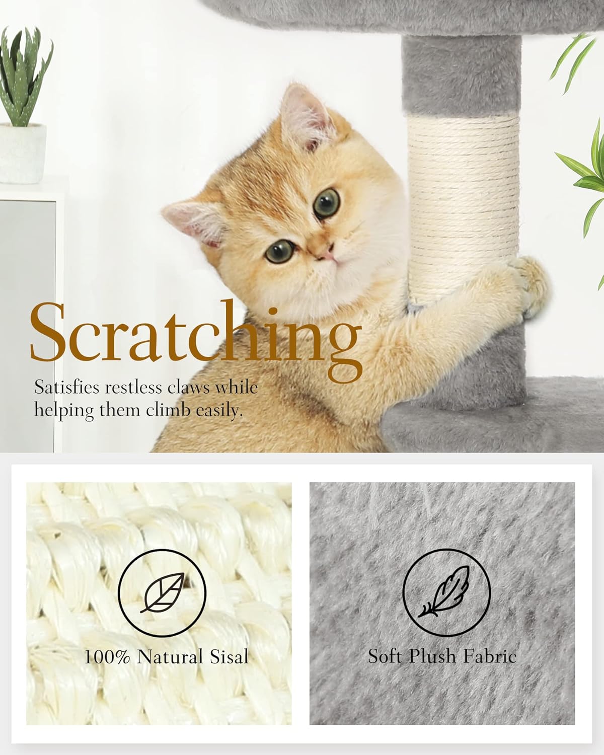 Árbol para gatos todo en uno: diseño de forma muy aerodinámica, tus encantadores gatitos pueden acostarse en la percha superior redonda acolchada para disfrutar de la sensación de estar en la parte superior, jugar con bolas interactivas cuando se aburre, descansar cómodamente en la hamaca y el condominio, rascarse completamente en el poste cubierto de sisal y la rampa de tabla de rascar curvada para obtener espacio adicional para rascar. El peluquero de goma suave hace que sean cómodos y eliminan el cabello suelto. Este árbol para gatos funciona perfectamente como una casa de juegos ideal para recreación
