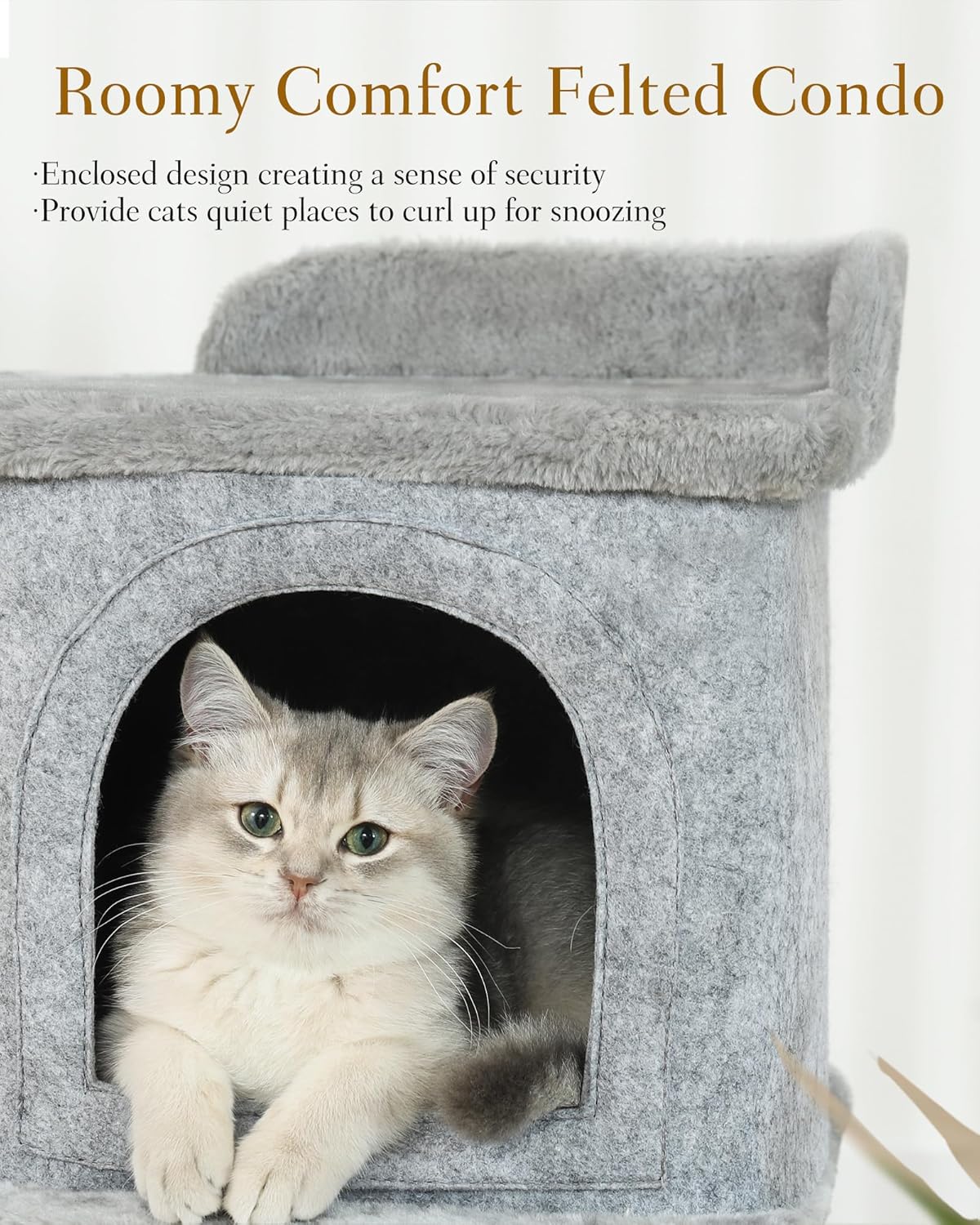 Materiales de calidad y protección: Dimensiones: 18.9 pulgadas de largo x 12.4 pulgadas de ancho x 36.6 pulgadas de alto. El árbol para gatos de varios niveles se compone de tablero de partículas de alta calidad con cubierta de felpa agradable al tacto. La tabla de rascar y el poste curvados están equipados con cuerda de sisal natural para que los gatos rayen y afilen sus garras sin dañar tus propios muebles. El condominio para gatos grandes está hecho de fieltro de lana natural, que es ecológico y se puede utilizar durante cuatro estaciones.
