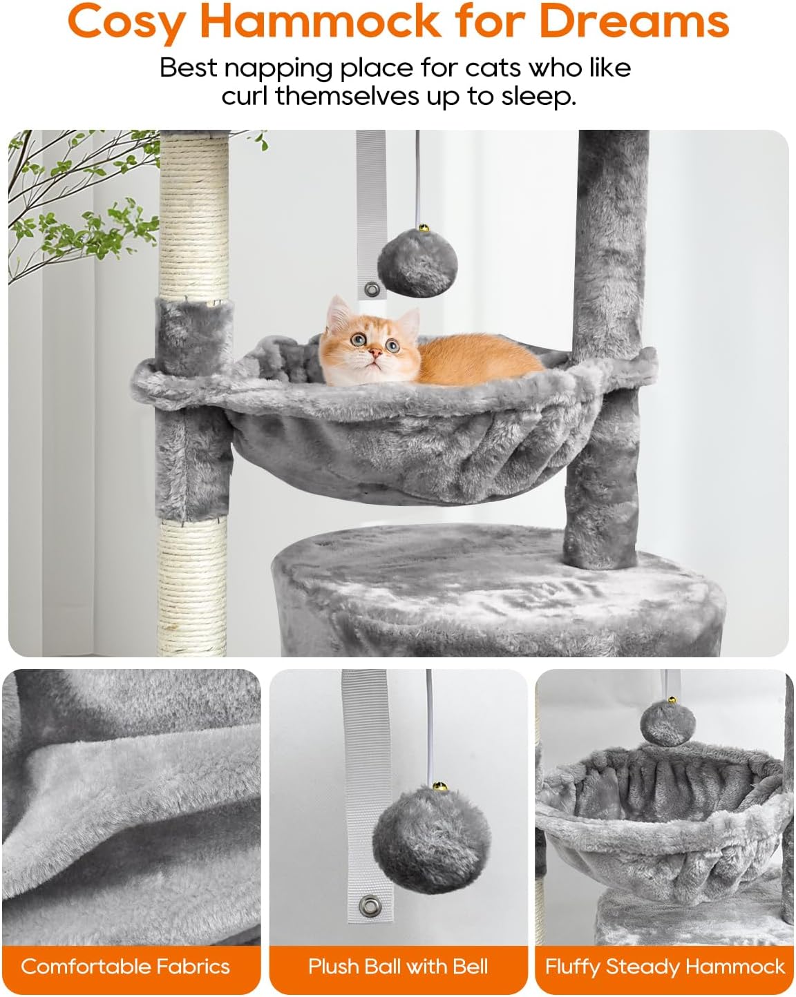 Árbol multiusos para gatos: este es un hogar acogedor ideal, tus gatitos pueden bostezar en la percha superior, derretirse en la tumbona de canasta, dormir en la cueva del gato. Tus amigos peludos pueden jugar con la pelota colgante, proporcionando un montón de diversión para tu felino