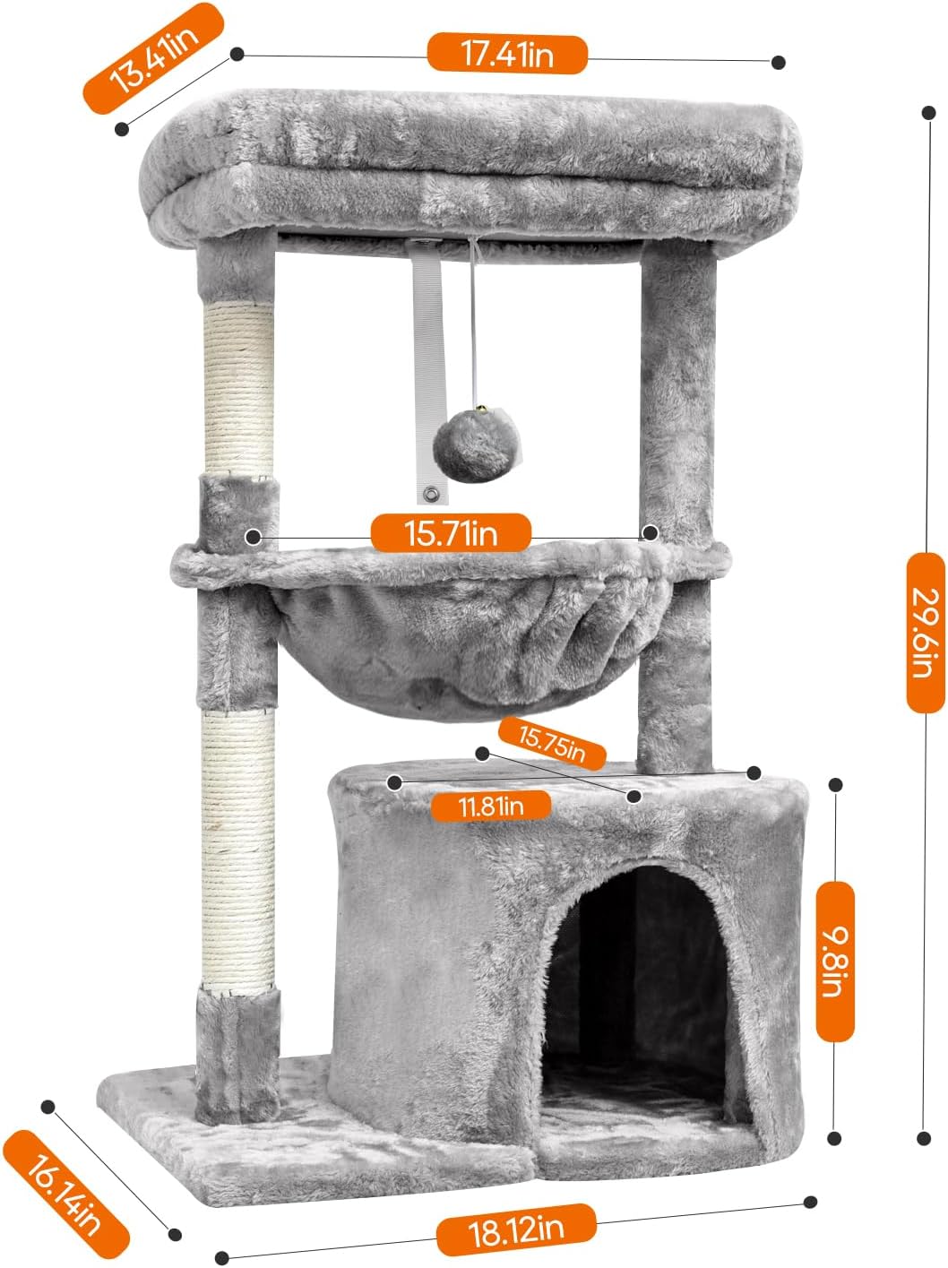Fácil de montar: esta torre para gatos es fácil de armar con instrucciones gráficas detalladas (idioma español no garantizado). Dimensiones totales: 16.14 pulgadas de largo x 16.14 pulgadas de ancho x 29.6 pulgadas de alto. Este árbol de juego para gatos en gris clásico decorará tu habitación como un mueble moderno para gatos