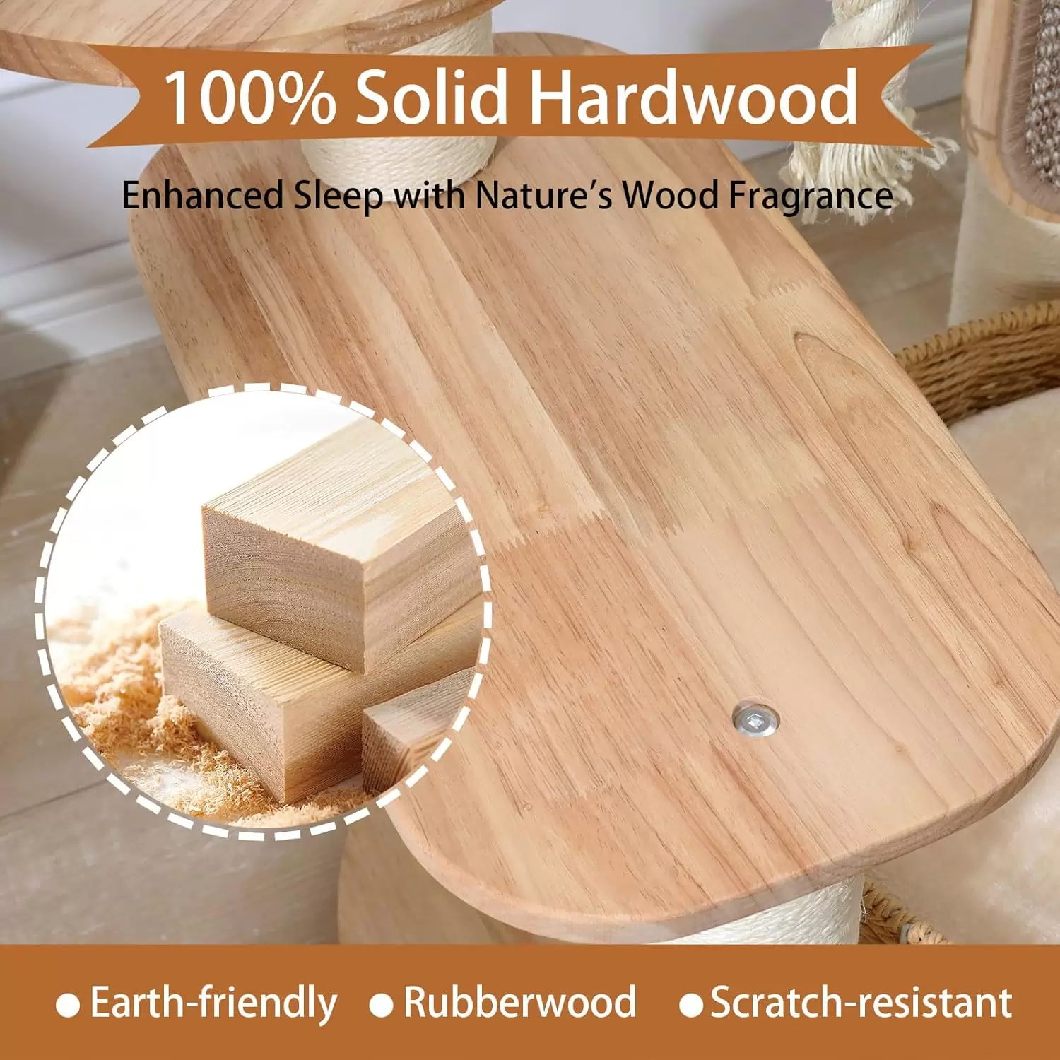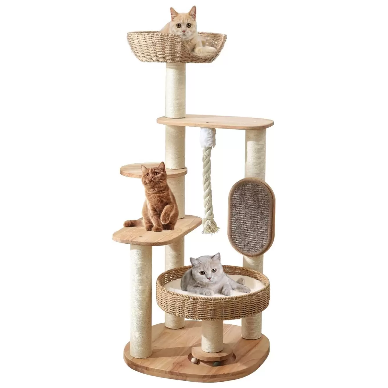 Rascador de madera pura y ratán (126 cm). Estabilidad sólida con postes de 3 pulgadas. Dos camas grandes y fácil limpieza. Ideal para gatos grandes.