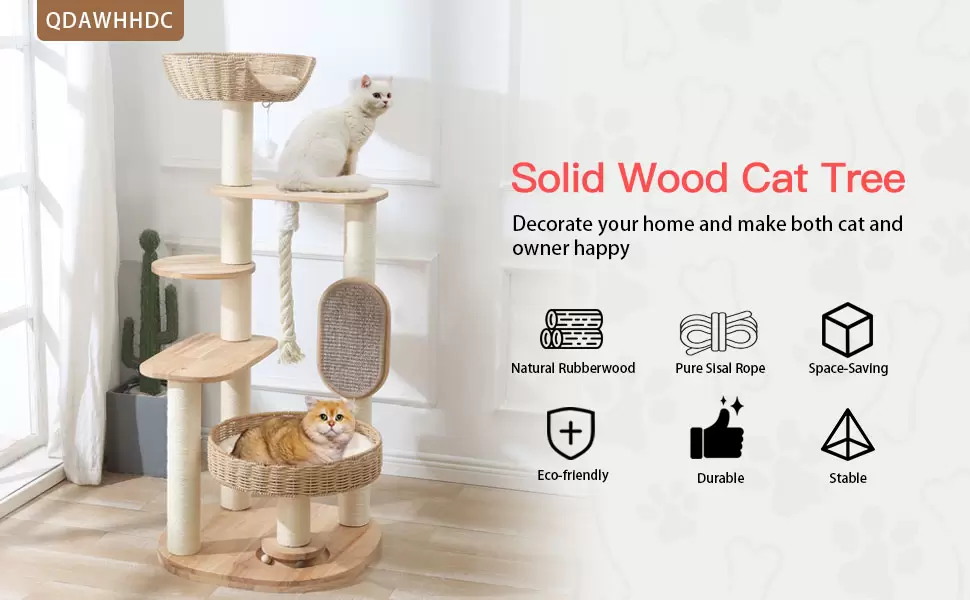Madera Goma Pura: Hecho de madera de goma pura con postes de sisal de tres pulgadas de grosor, además de un nido de ratán tejido a mano.