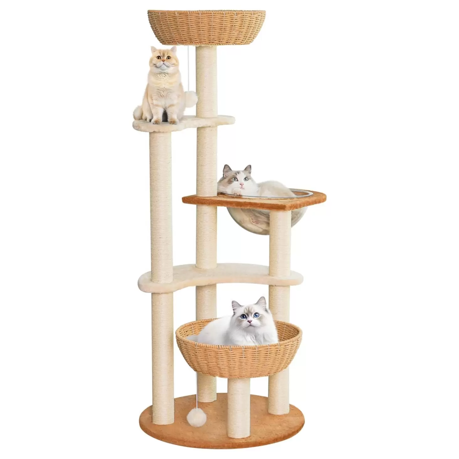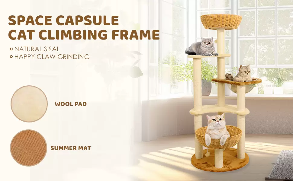 Rascador de lujo para gatos grandes. 141 cm, diseño con vaina espacial y materiales naturales. Estabilidad anti-sacudidas y cero olor. Escalera para fácil acceso.