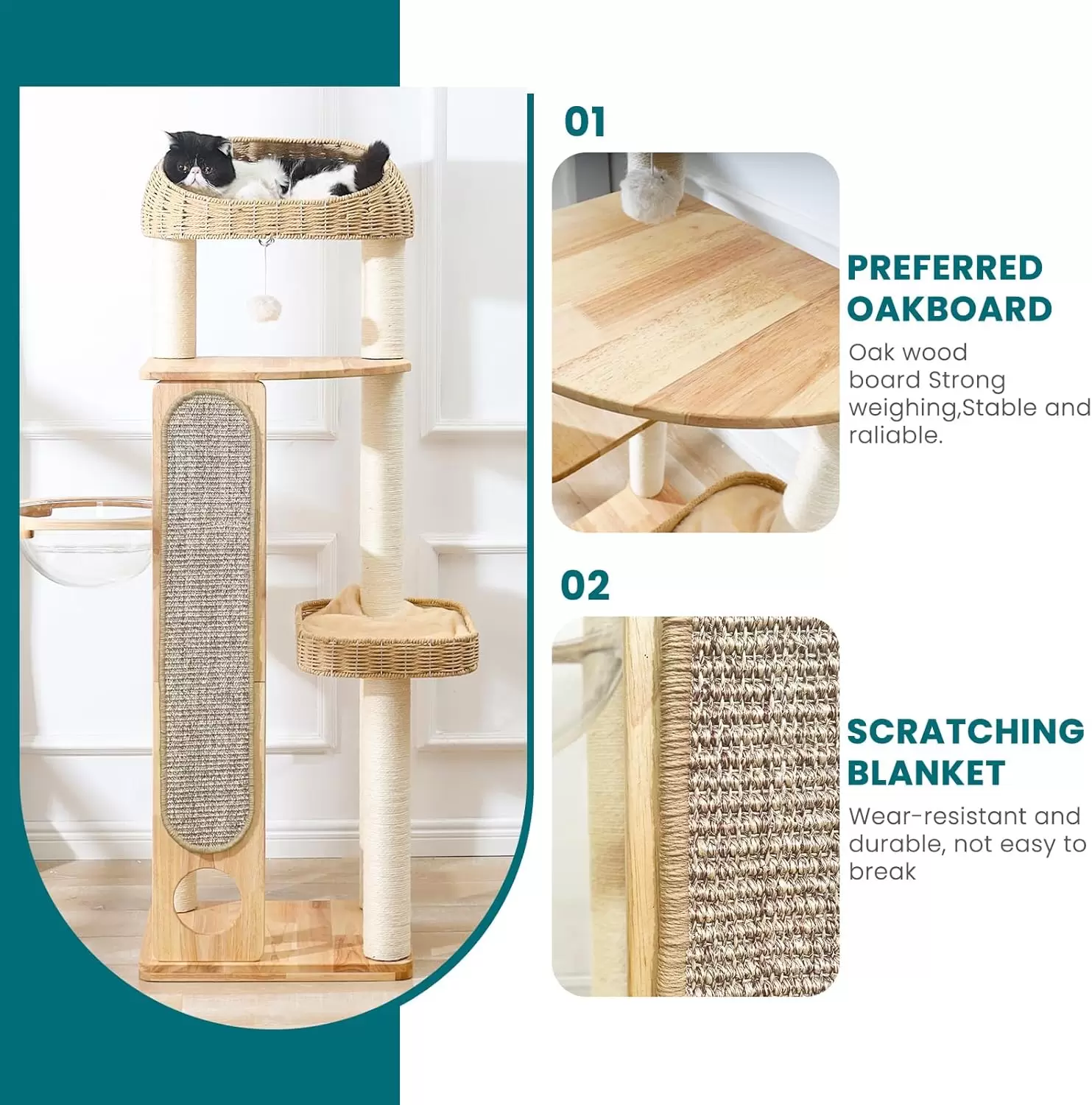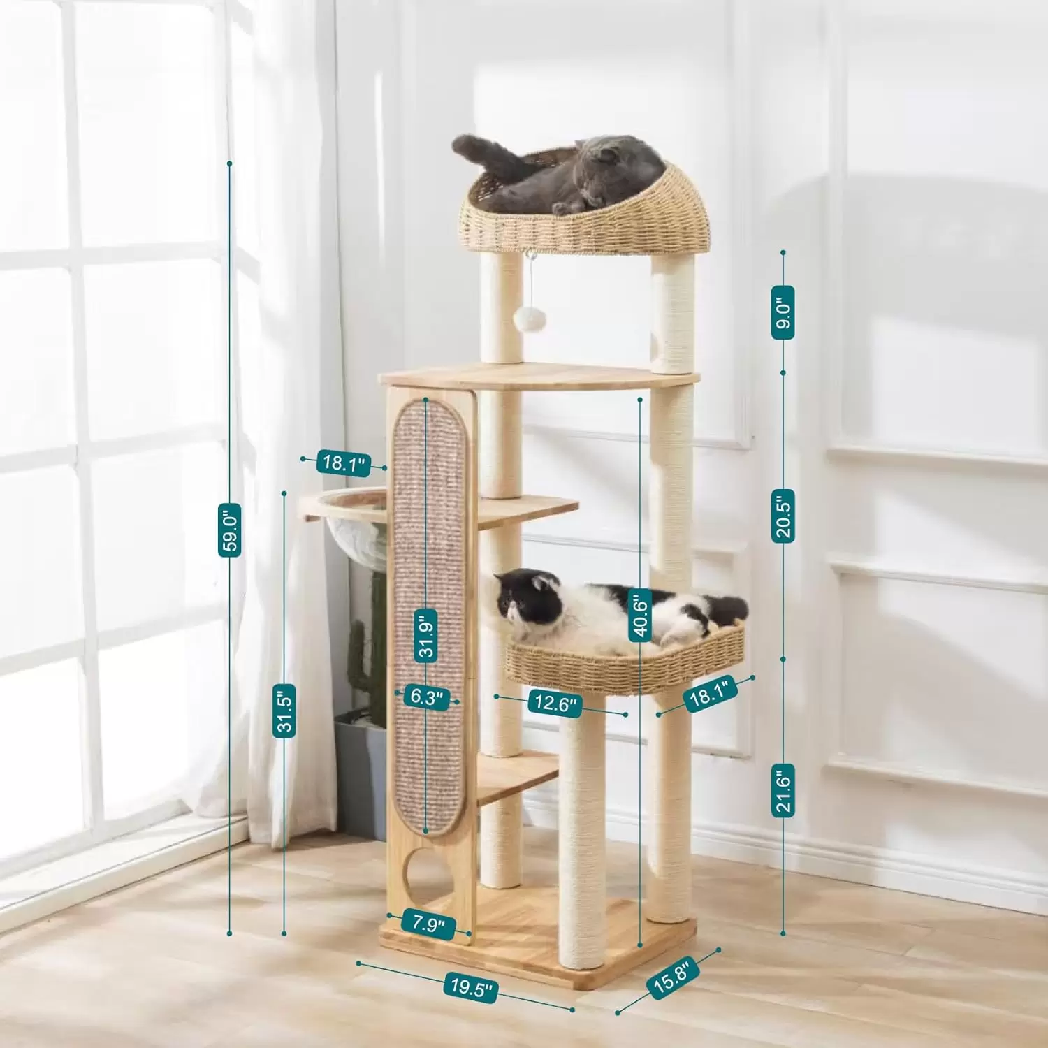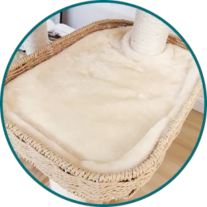 Características Únicas: Incluye una canasta de bambú tejida a mano, una manta de sisal extra larga para rascar y una innovadora sala de cápsula espacial.
