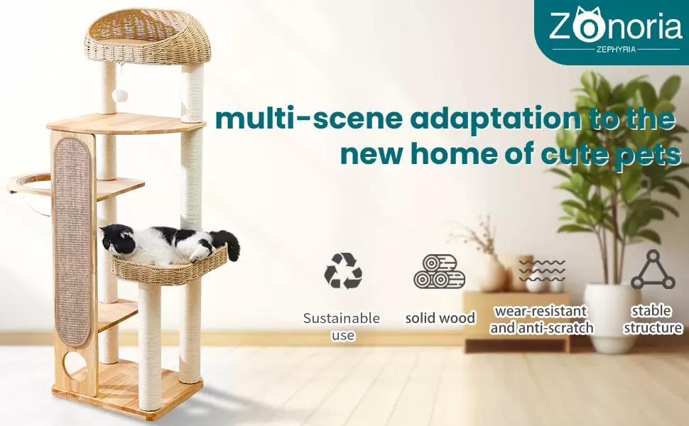 Rascador de madera pura de 150 cm. Base robusta y postes de 8 cm que aseguran firmeza total. Incluye cápsula espacial y canasta de bambú tejida. Diseño moderno y fácil limpieza.