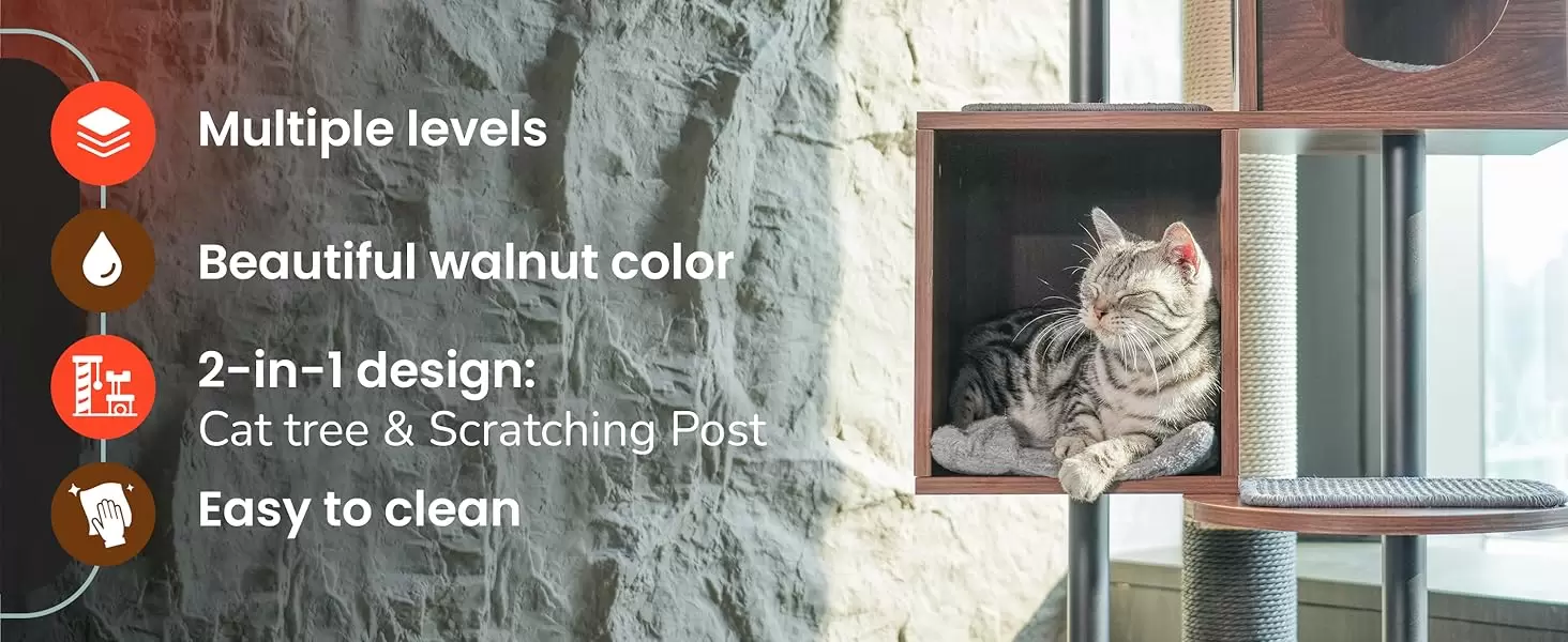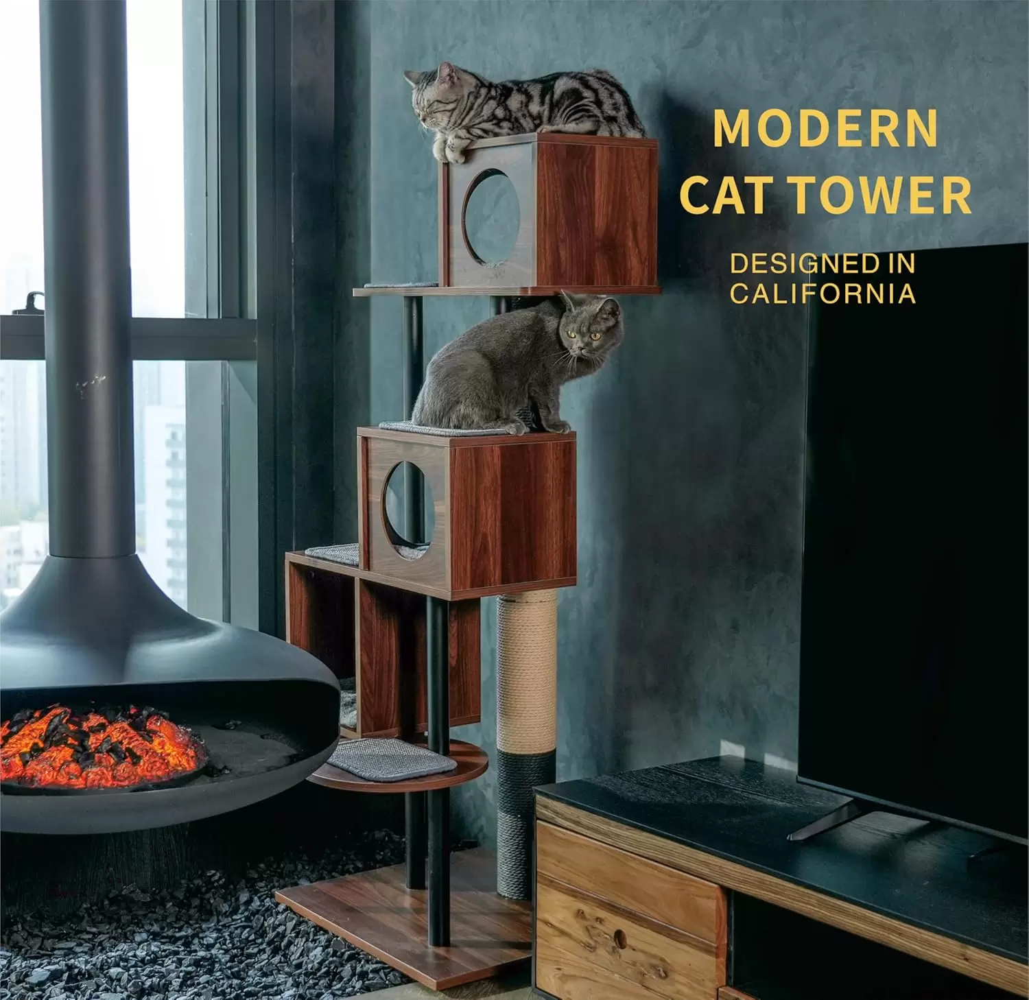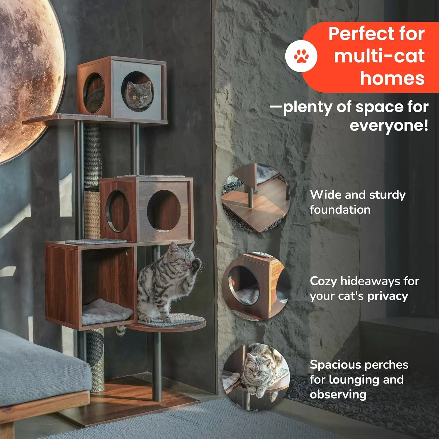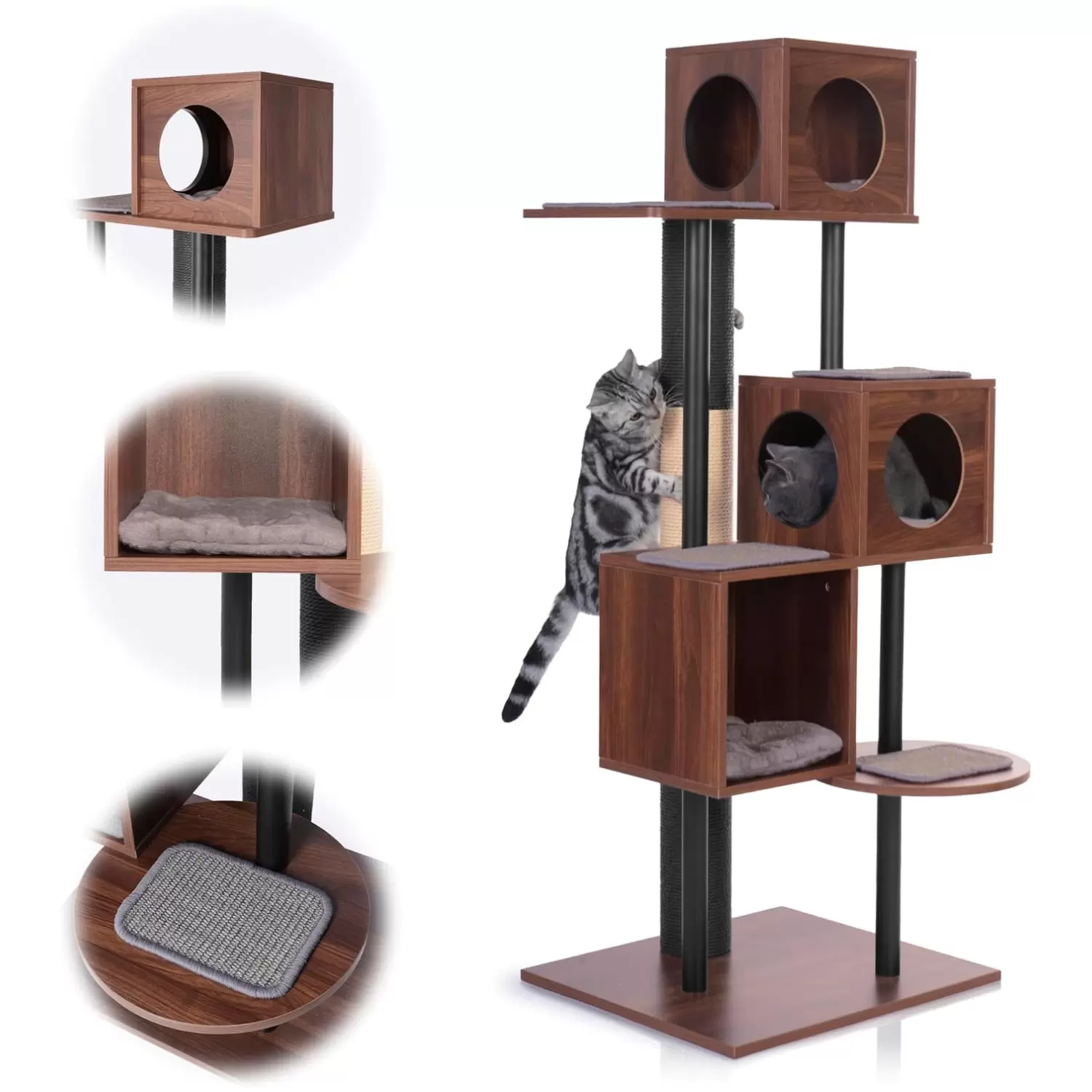 Torre rascadora de 151 cm con diseño de madera elegante. Firmeza y tres condominios. Ideal para gatos activos y casas con estilo moderno.