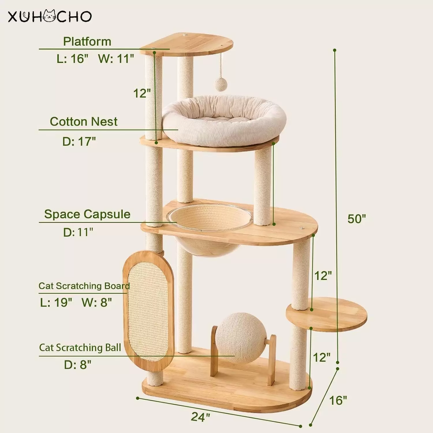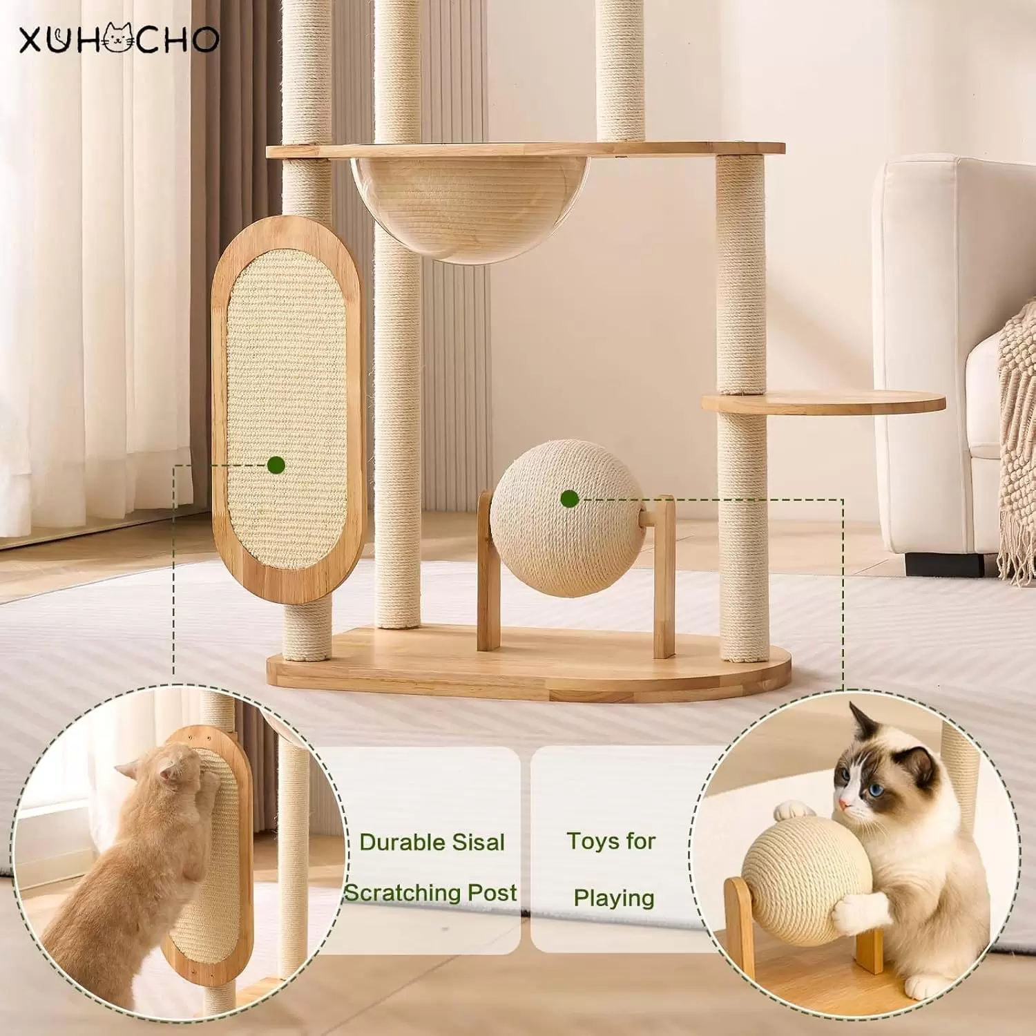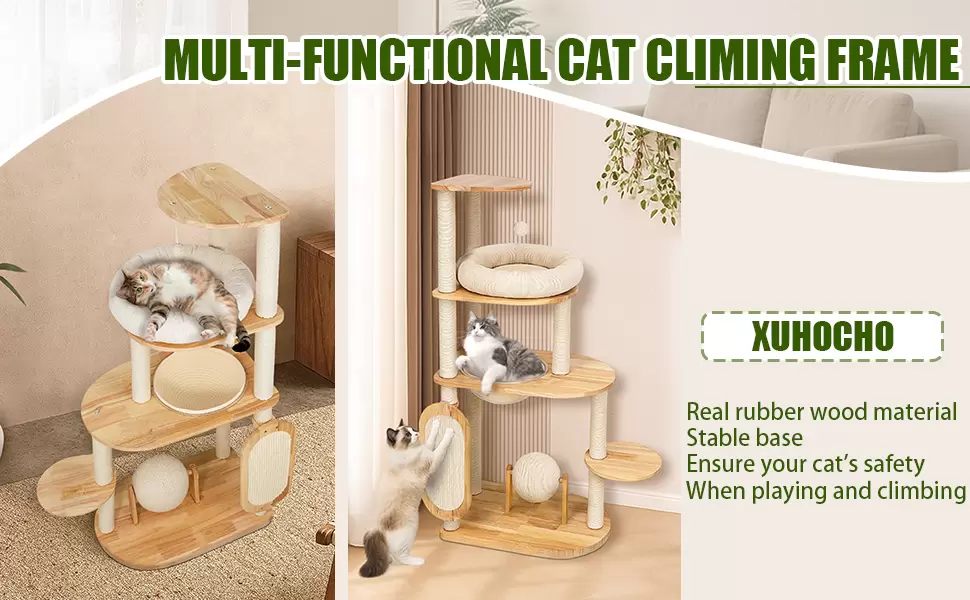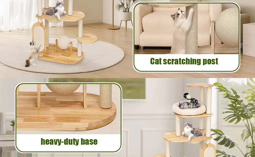 Estabilidad Extrema y Alta Capacidad: Madera de Caucho Natural: Fabricado con madera de caucho natural, lo que asegura una estructura resistente y estable. Firmeza Robusta: Diseñado con una placa base resistente, soporta de tres a cinco gatos simultáneamente, asegurando un centro de actividad estable. Sisal Duradero: Prepara postes rascadores duraderos que satisfacen los instintos naturales sin dañar sus muebles.