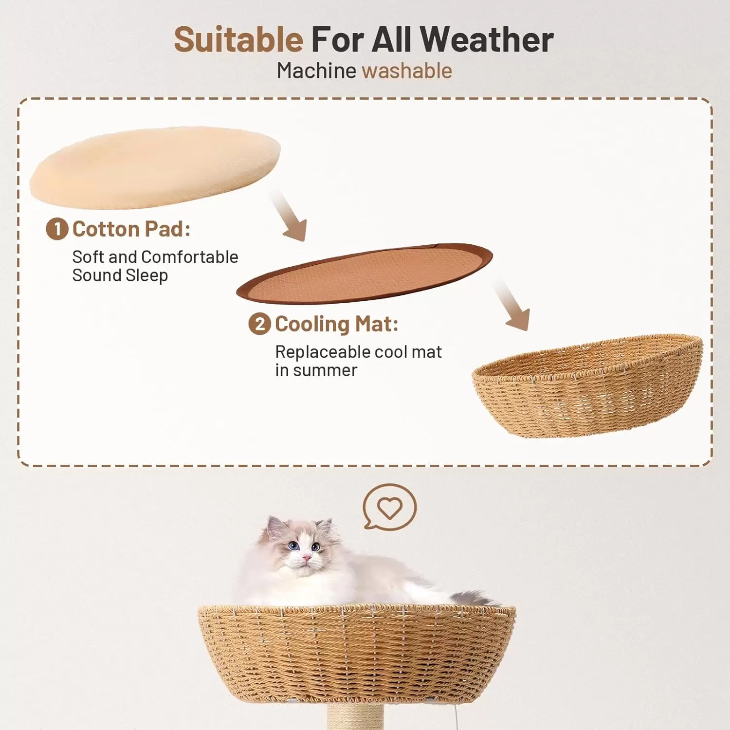 Comodidad Adaptable a Todas las Estaciones: Confort Anual: Cuenta con dos cojines de felpa lavables a maquina (para el frio) y una alfombrilla de enfriamiento (para el verano), asegurando confort en cada temporada. Nido Transpirable: La cesta tejida de ratan es transpirable y perfecta para siestas acogedoras en un escondite ventilado.
