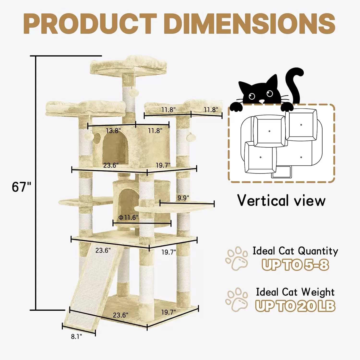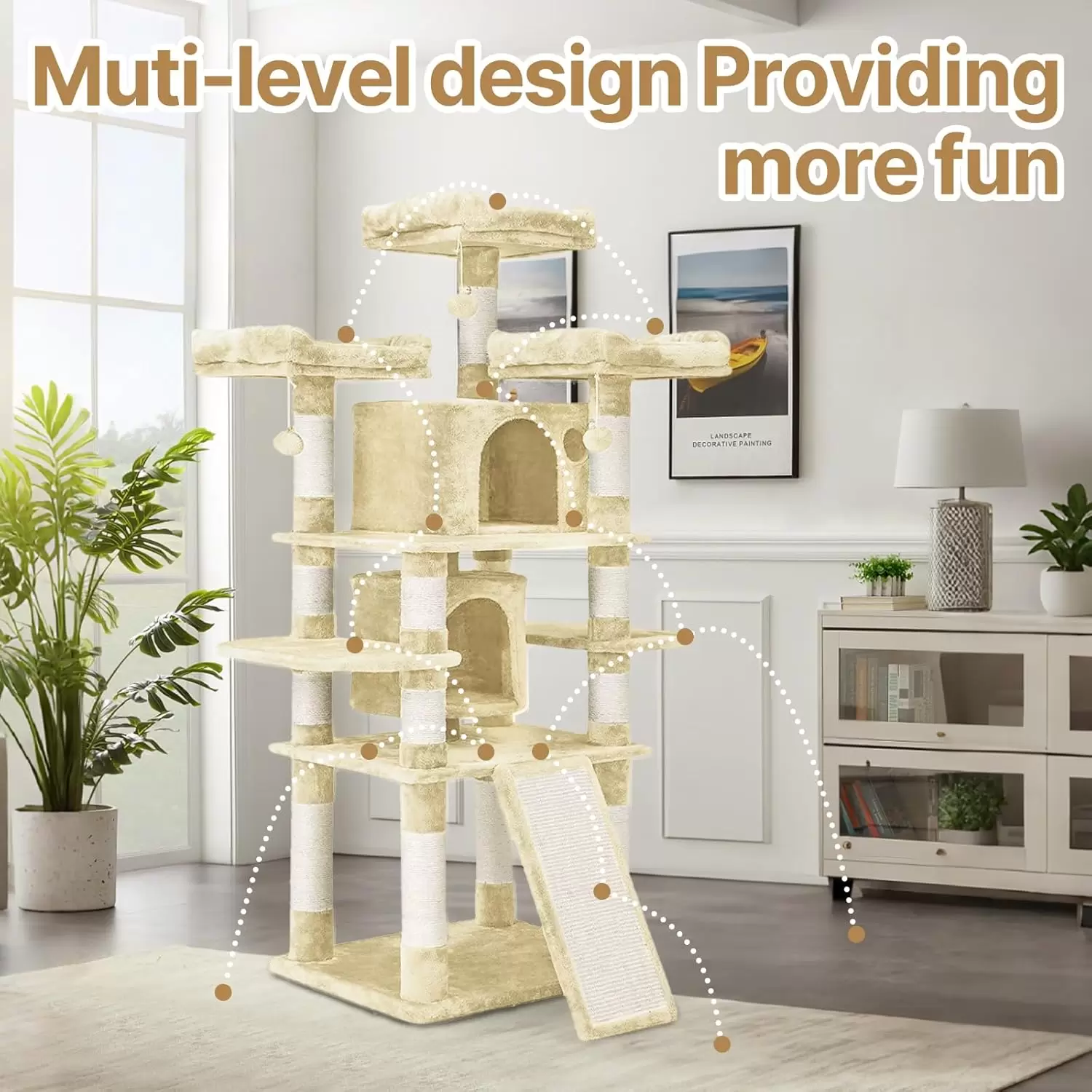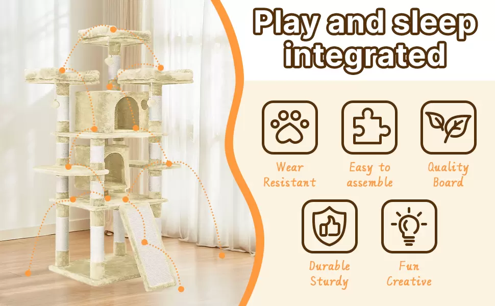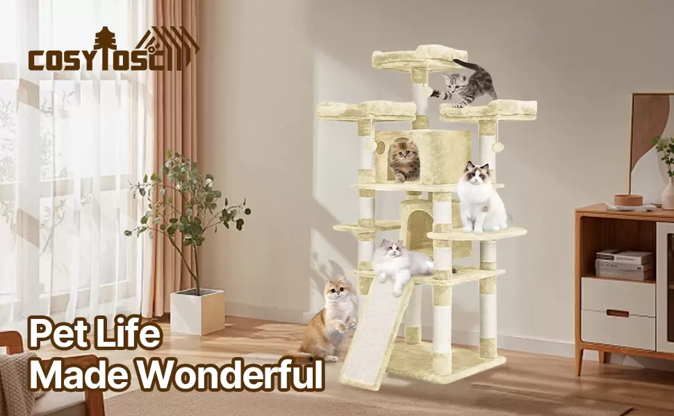 Este arbol para gatos de 170 centimetros combina una estructura firme con un diseño elegante que se mezcla con la decoracion de su hogar. Ofrece el equilibrio perfecto entre un parque de diversiones y un lugar de descanso seguro.