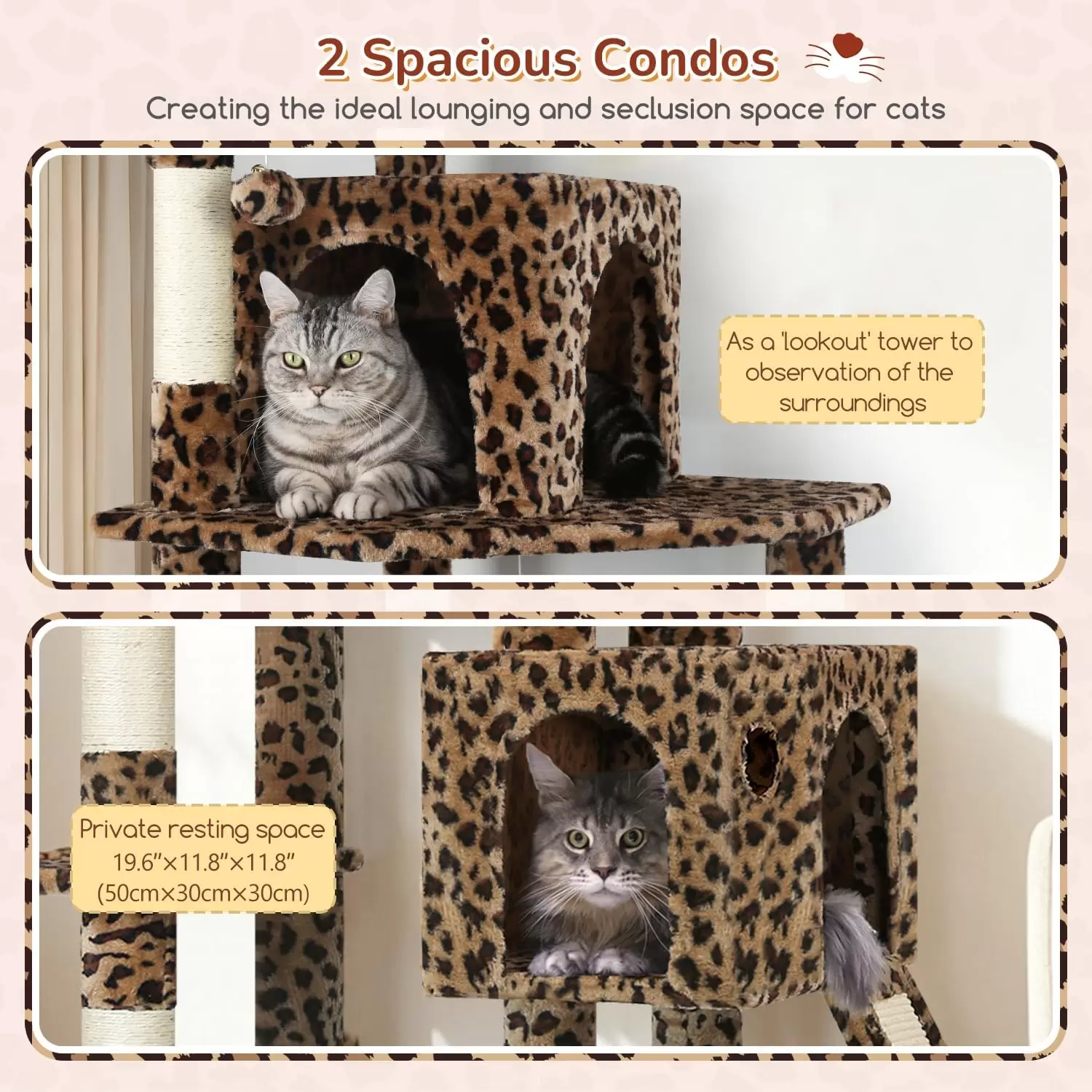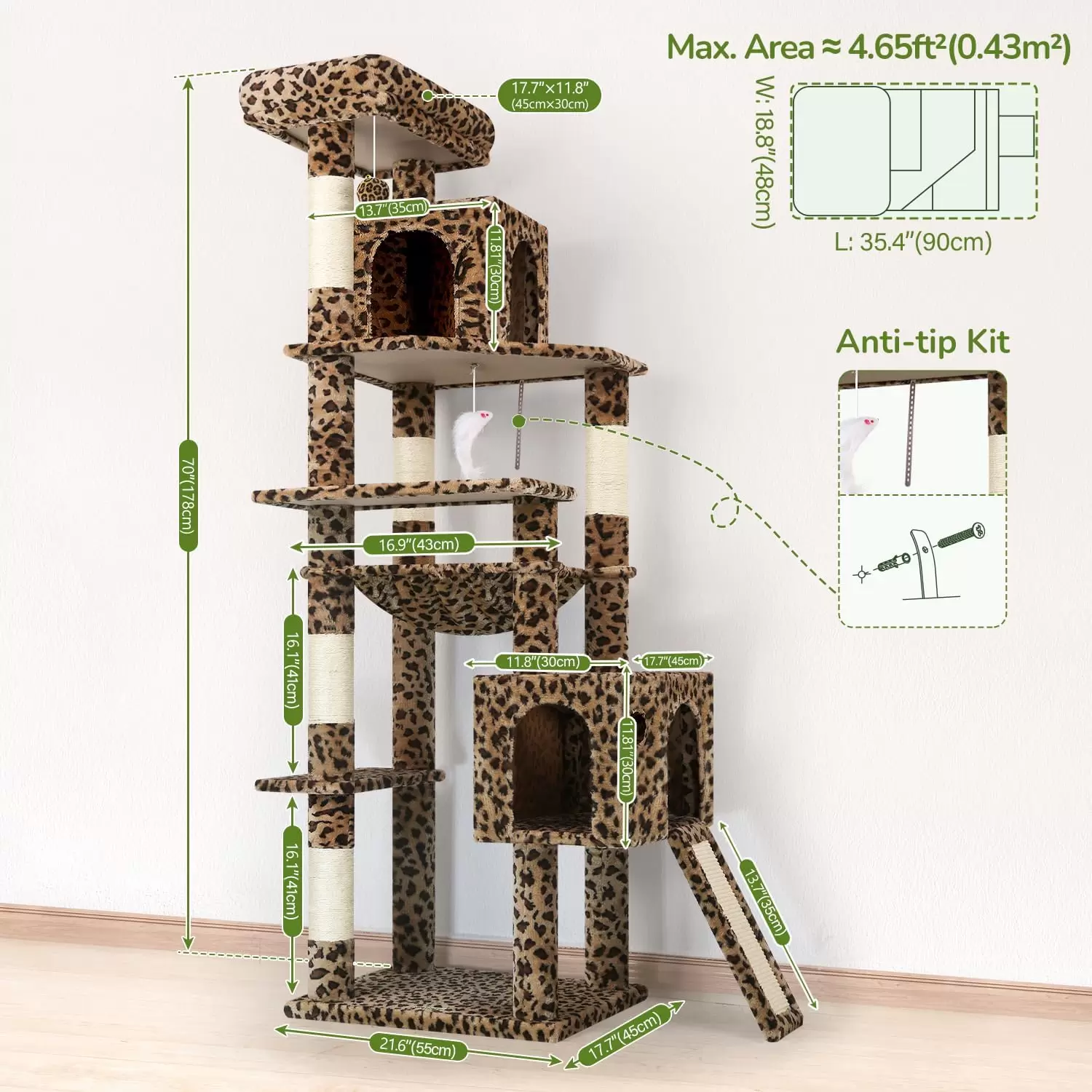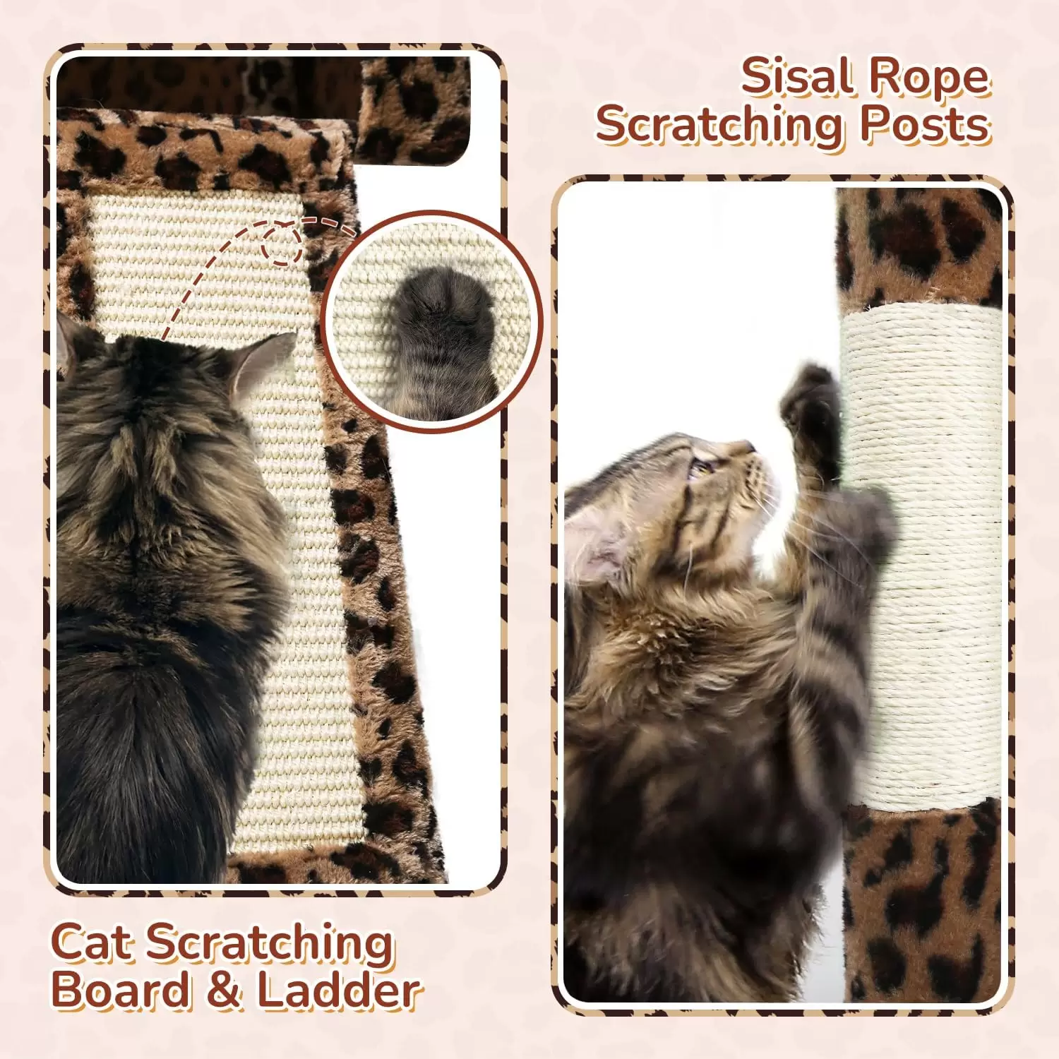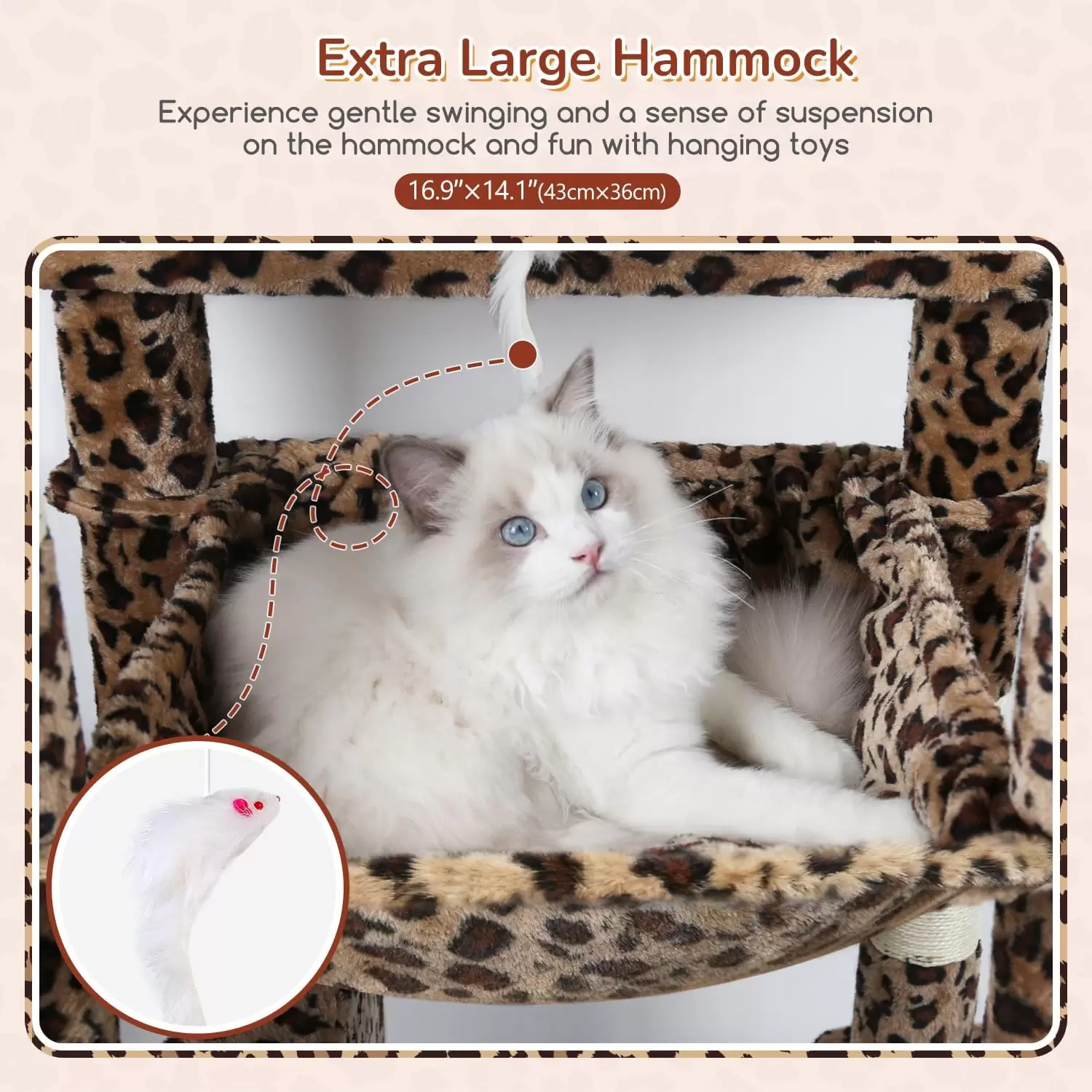 Torre rascador de 178 cm con diseño leopardo. Hamaca cuadrada XL y cama superior desmontable. Estructura robusta con sisal y condominio amplio para gatos grandes.