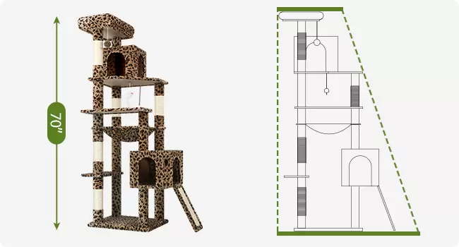 Esta torre alta es el mueble definitivo para quienes buscan estilo y comodidad. Su atrevido diseño animal print y su estructura robusta ofrecen un espacio de lujo para gatos grandes y activos.
