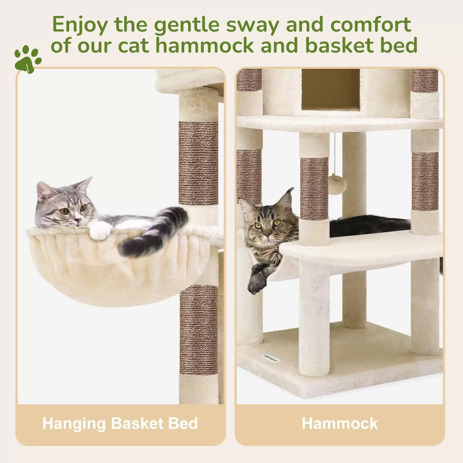 Hamaca de Felpa y Cesta Colgante: Diseñado pensando en la comodidad, incluye una hamaca de felpa y una acogedora canasta colgante que se balancea ligeramente. Estos elementos imitan la forma natural de descanso de los gatos, ofreciendo diversas opciones para la siesta con materiales de alta calidad.