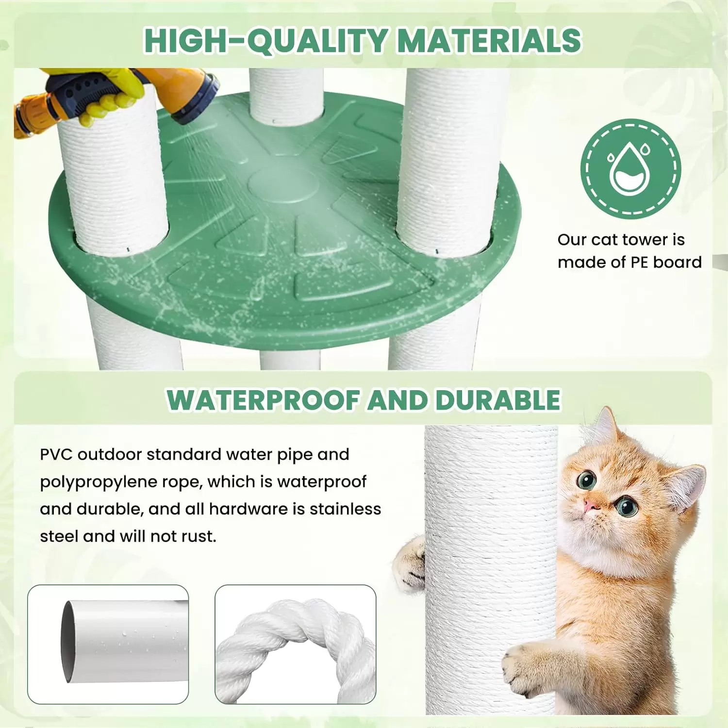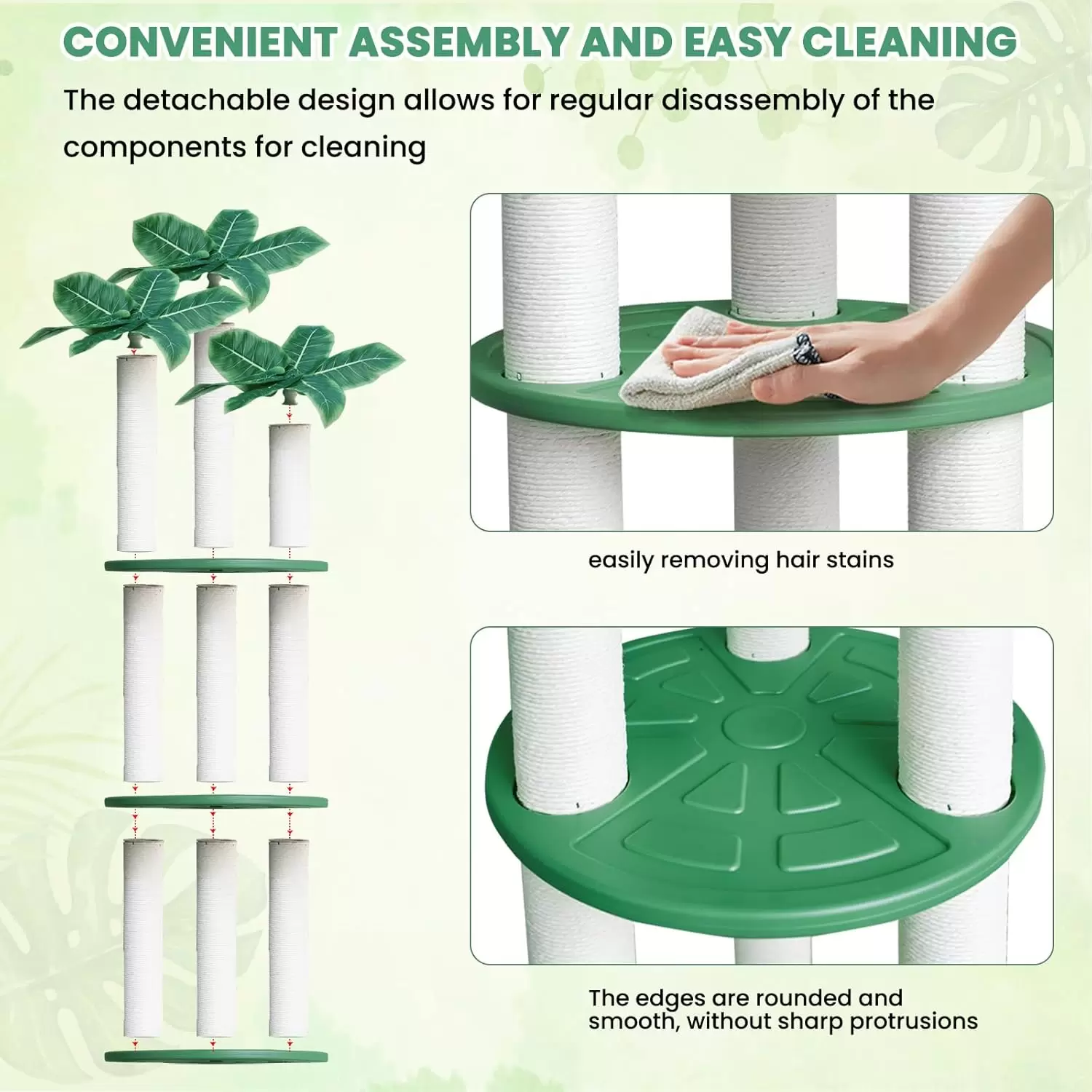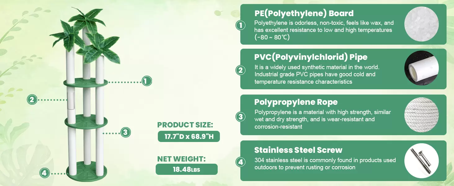 Decoración Natural: La parte superior está decorada con hojas verdes simuladas para crear un ambiente cercano a la naturaleza, estimulando la curiosidad del gato y aumentando su sensación de seguridad.