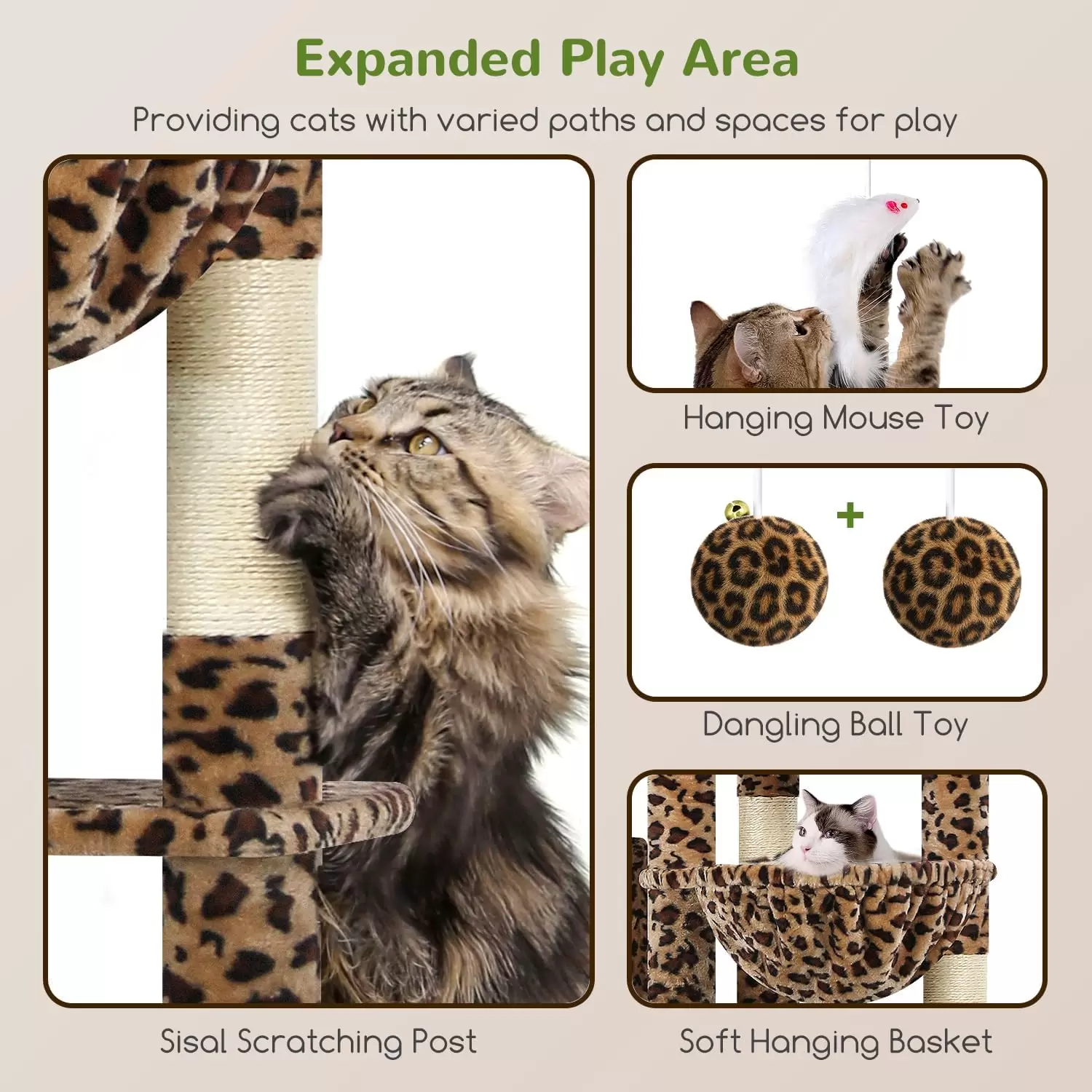 Estilo Unico Animal Print: Todo el arbol esta cubierto con un llamativo diseño de leopardo, convirtiendose en una pieza decorativa que añade un toque de aventura a su hogar. Es perfecta para quienes buscan salir de lo comun y ofrecer un gimnasio con estilo.
