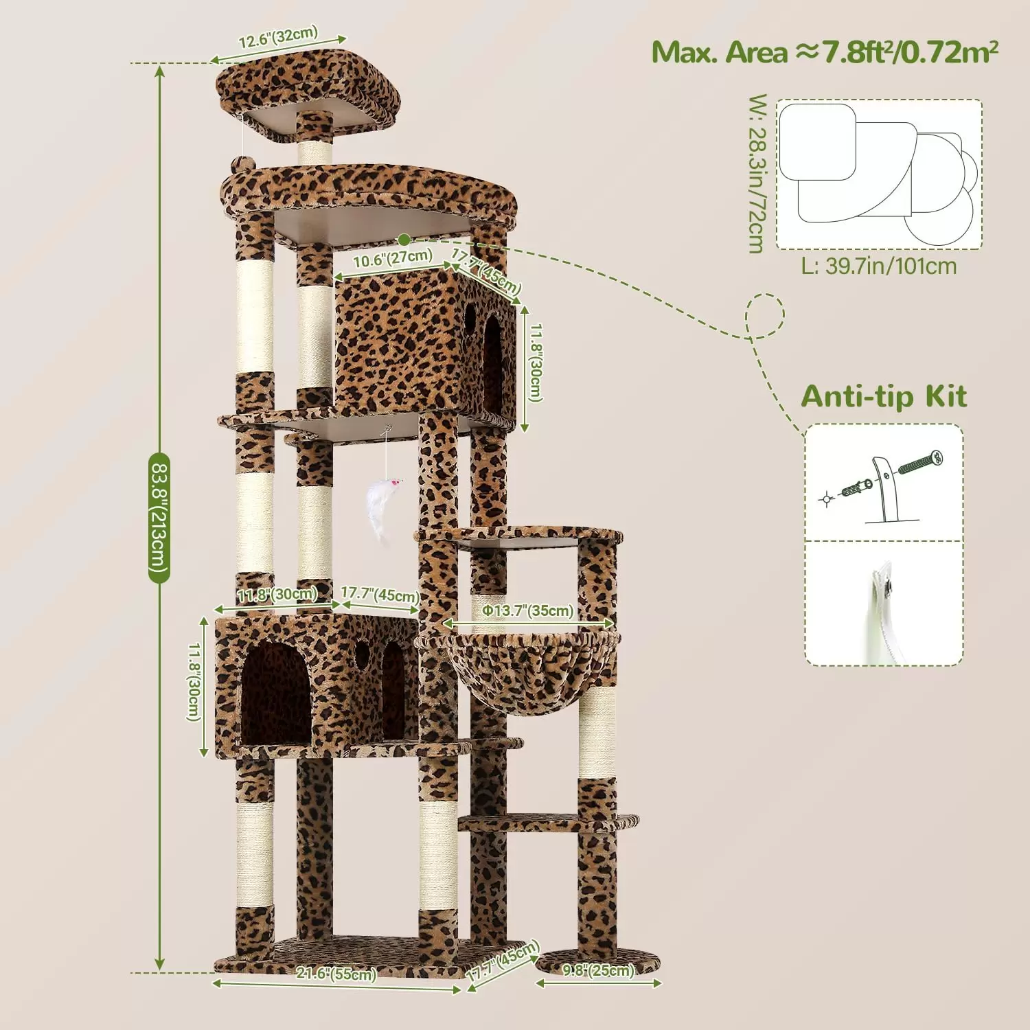 Torre rascador leopardo de 213 cm con diseño trapezoidal estable. Dos condominios amplios y plataforma XL. 9 postes de sisal para diversion total de gatos grandes.