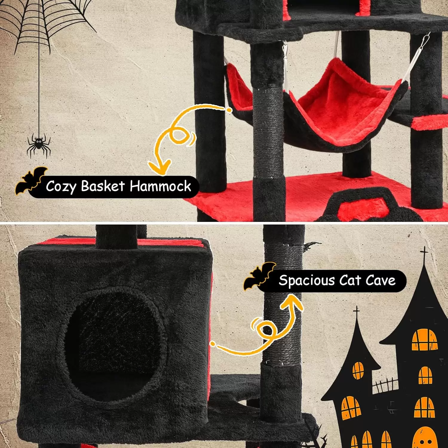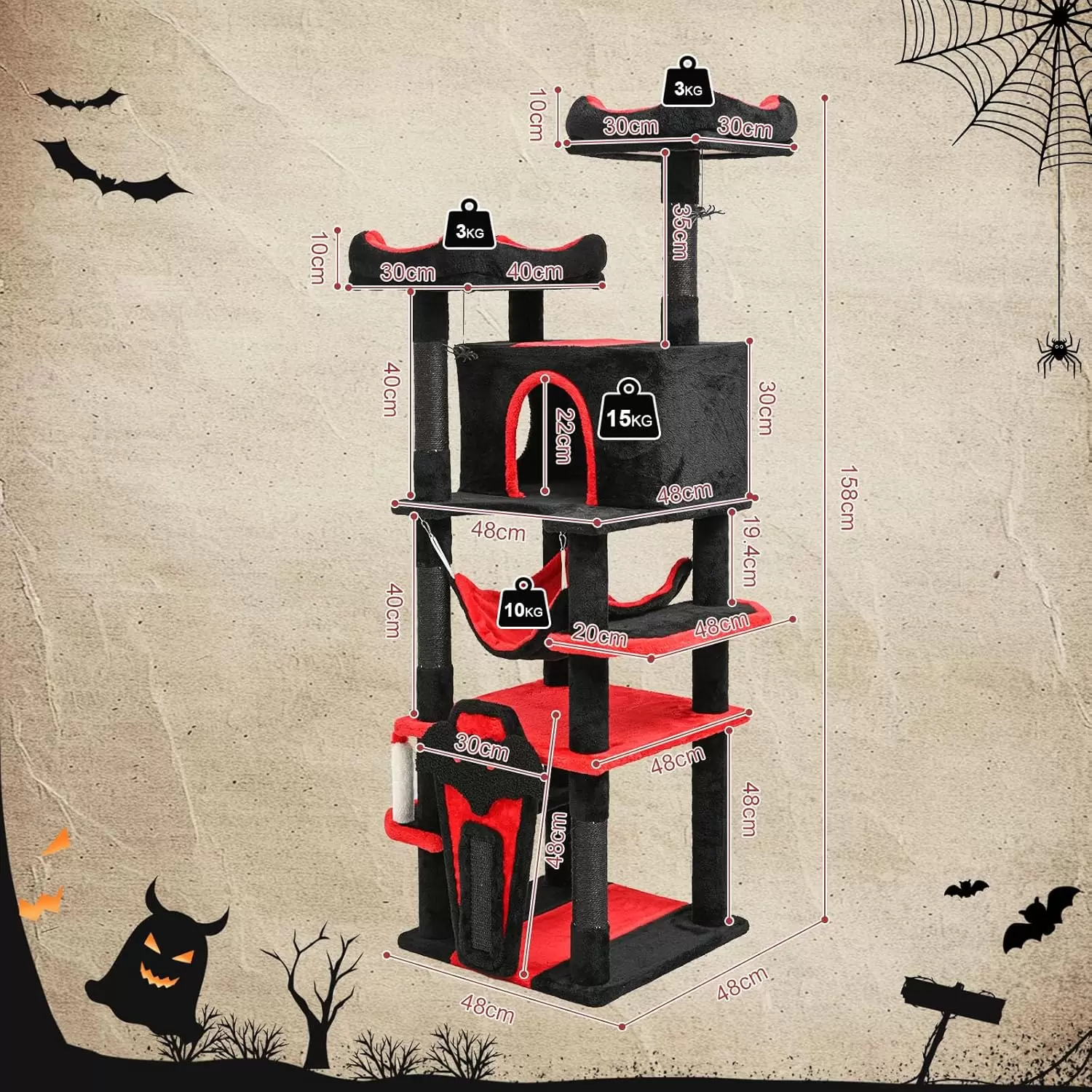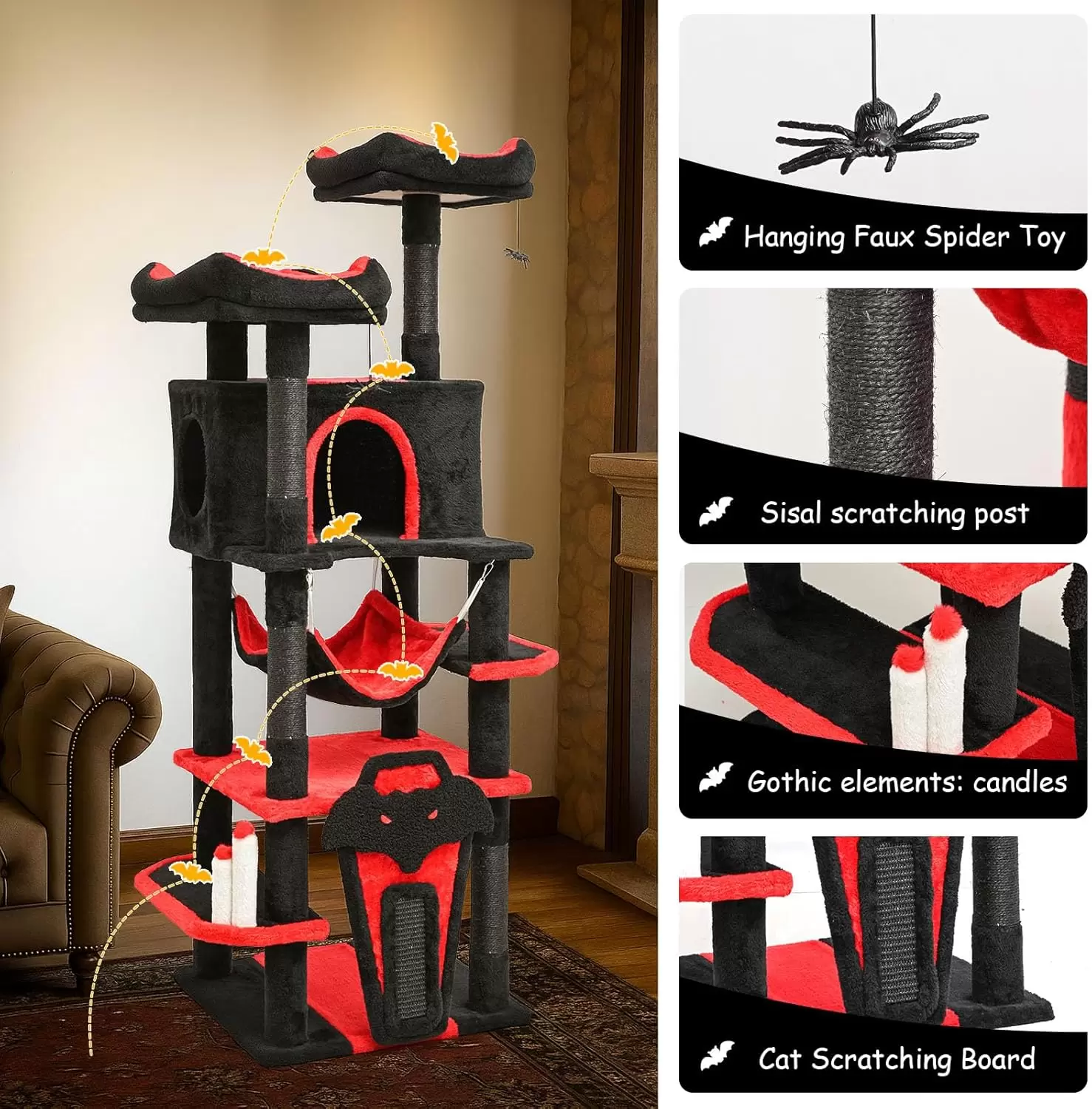 Torre rascadora gótica (156 cm) con diseño de murcielagos y arañas. Robusta, con dispositivos anti-punta y cama cerrada para la seguridad de sus gatos.