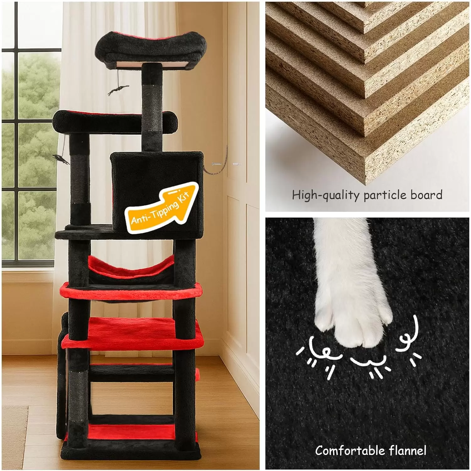 Anti-Vuelco: El árbol viene equipado con dispositivos anti-punta para garantizar la seguridad de sus gatos mientras juegan enérgicamente.