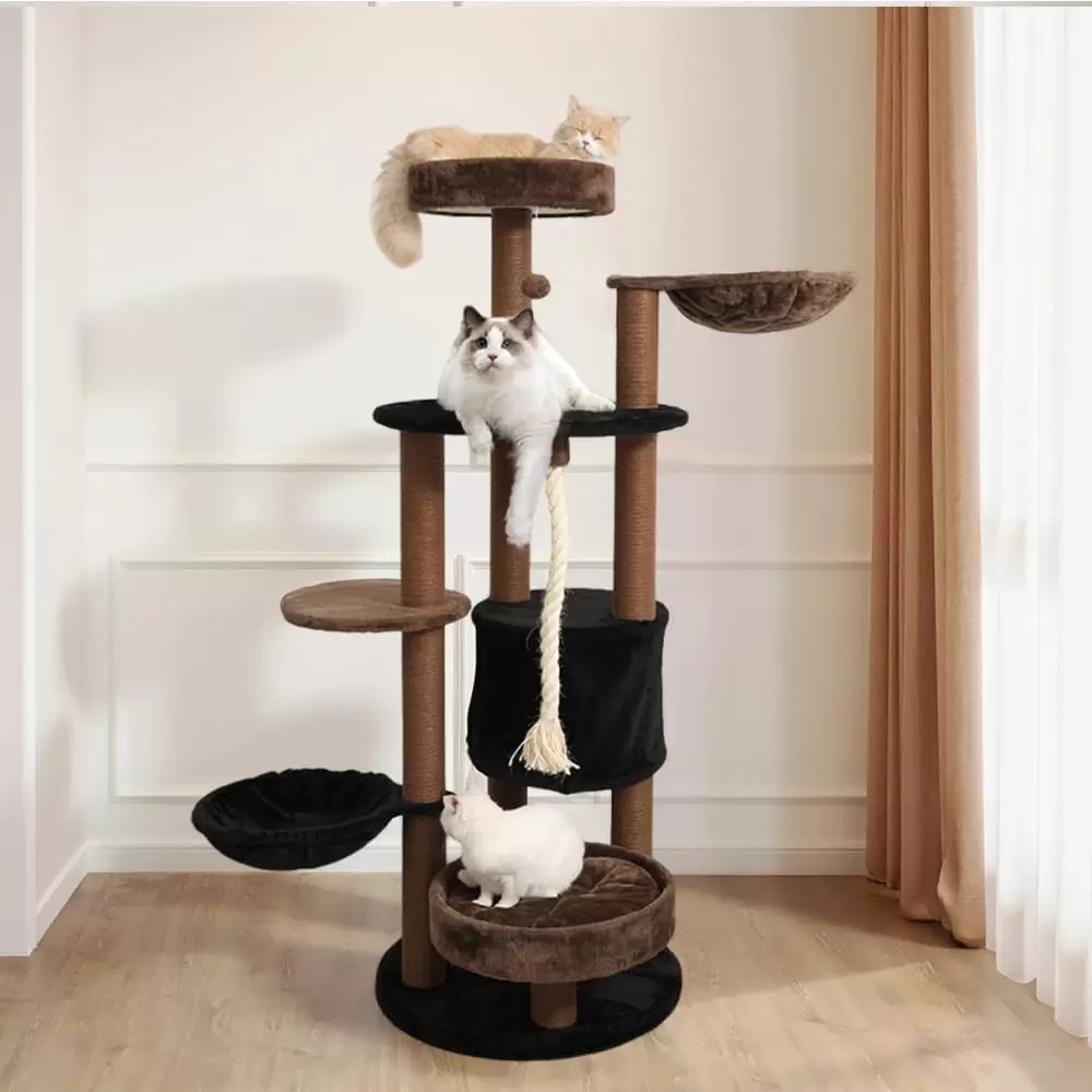 Diseño Integral de Varios Niveles: Cuenta con un acogedor condominio, dos hamacas de felpa, multiples plataformas de salto y una base gruesa acolchada. Ademas, incluye una cuerda de sisal colgante y un juguete de pelota de peluche para una diversion sin fin.