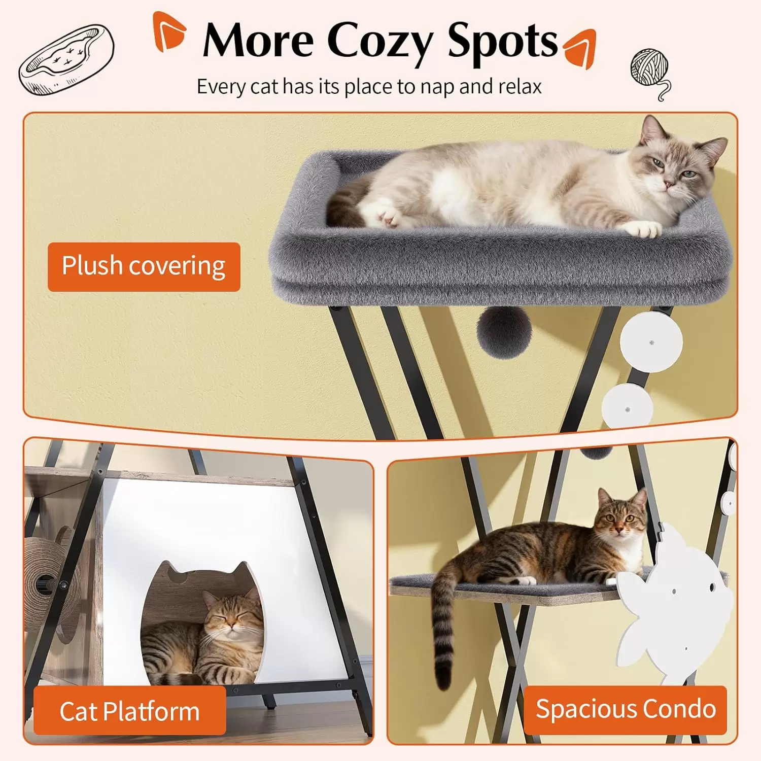 Felpa Suave y Acogedora: La hamaca y las plataformas están cubiertas con felpa suave, creando un ambiente seguro y acogedor. Perfecto para estirarse o acurrucarse perezosamente.