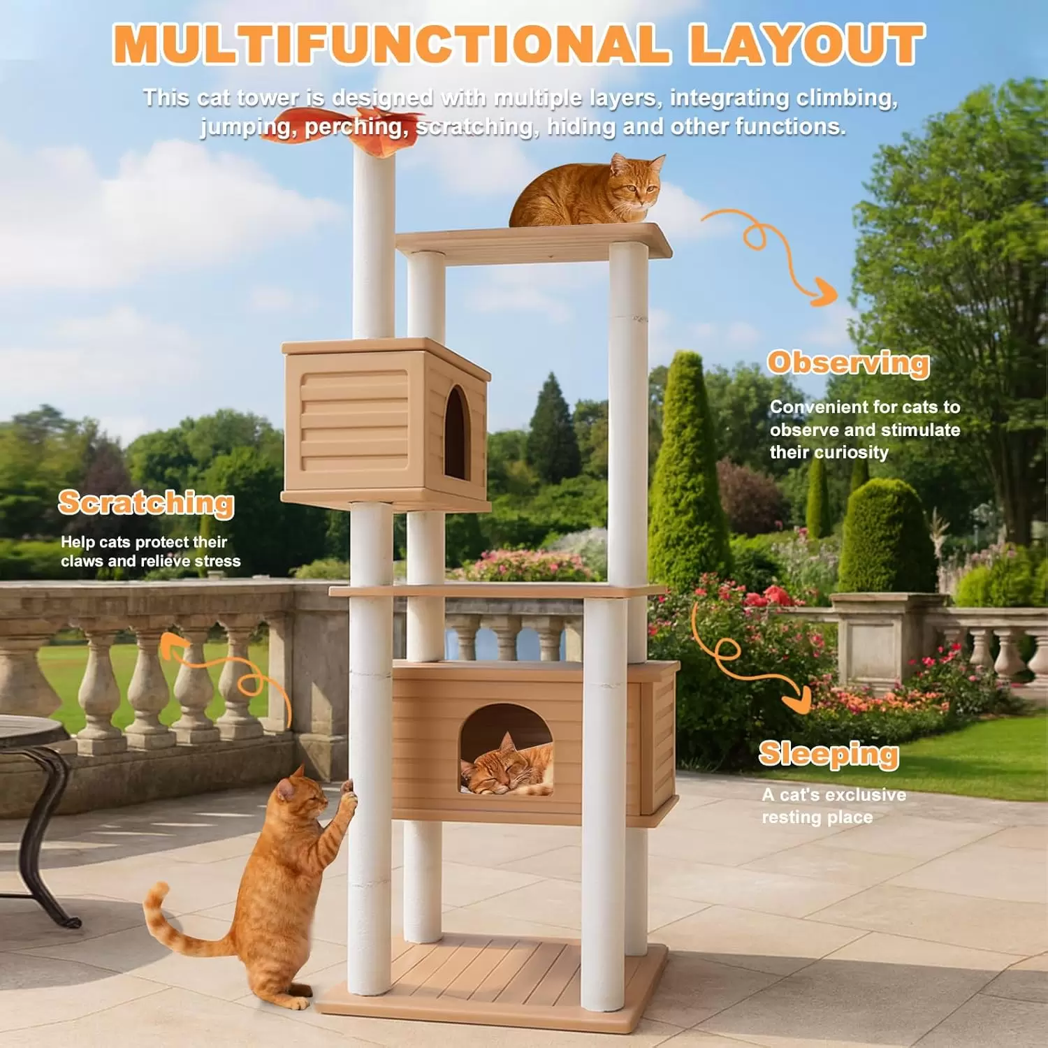Torre rascadora de 165 cm, a prueba de agua y anti-óxido. Incluye dos condominios para gatos múltiples. Diseño ligero, ideal para terraza o interior.