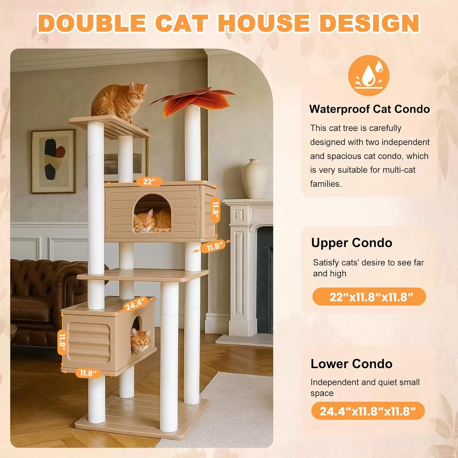 Dos Condominios Privados: Incluye dos casitas independientes y espaciosas, ideales para familias de varios gatos. Esto reduce la lucha y el estrés causado por la competencia por el espacio.