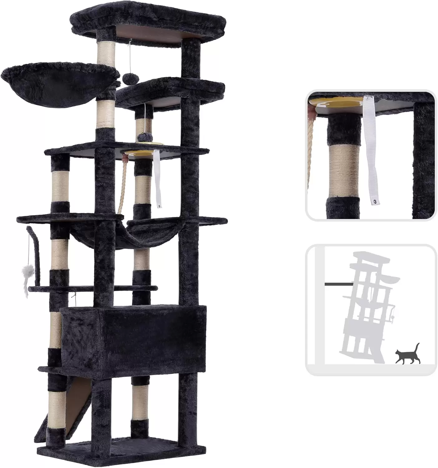 Perchas Sobredimensionadas: Cuenta con dos perchas superiores ensanchadas y con acolchado suave. Esto permite a los gatos disfrutar de la vista o descansar tranquilamente, incluso si son de gran tamaño.