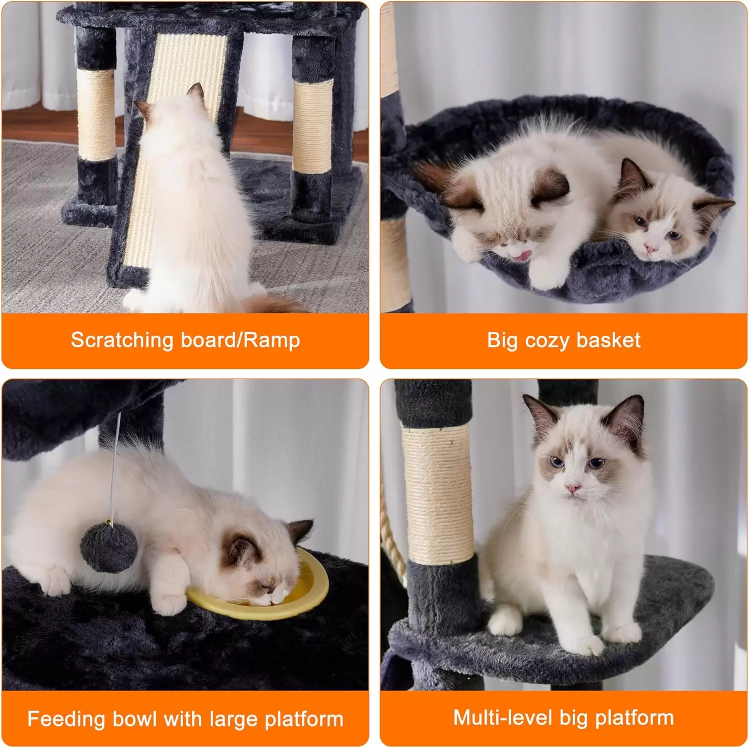 Canasta Acogedora: Incluye una canasta colgante que es ideal para que los gatos “gorditos” (grandes) se acurruquen, proporcionándoles la sensación de estar envueltos y seguros.