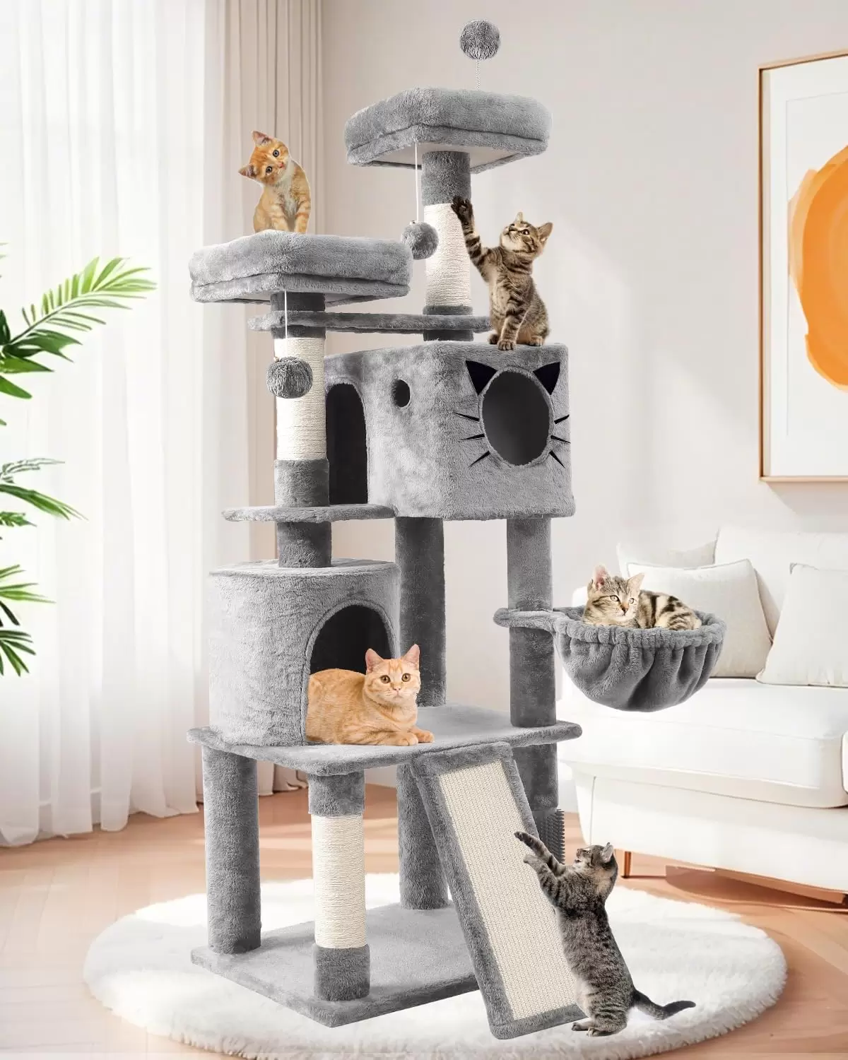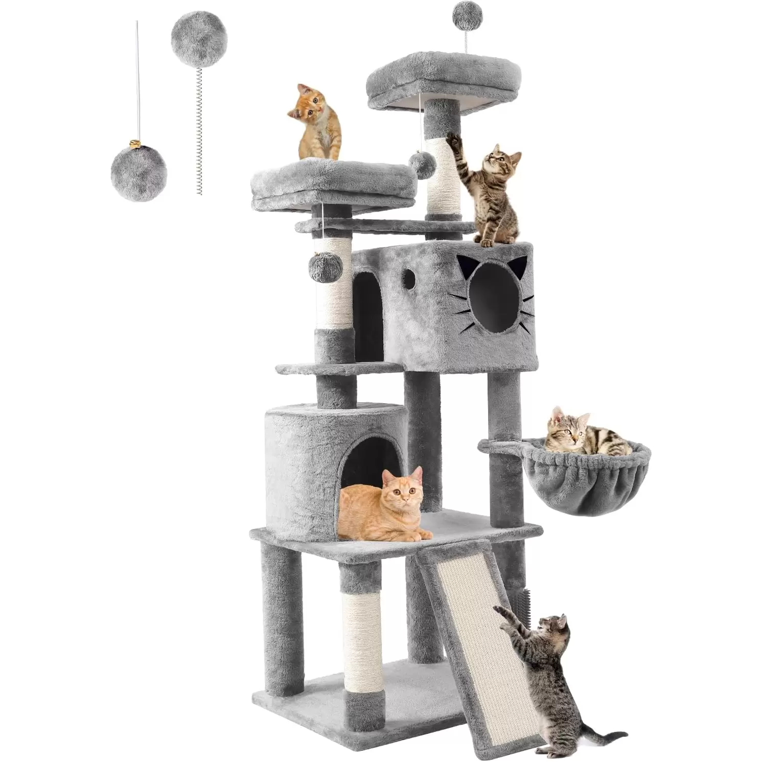 Este centro de actividades de 170 centimetros ha sido diseñado por ingenieros estructurales para ofrecer la máxima seguridad. Con una rampa rascadora única y cuevas de tamaño real, es el hogar definitivo para varios gatos activos.