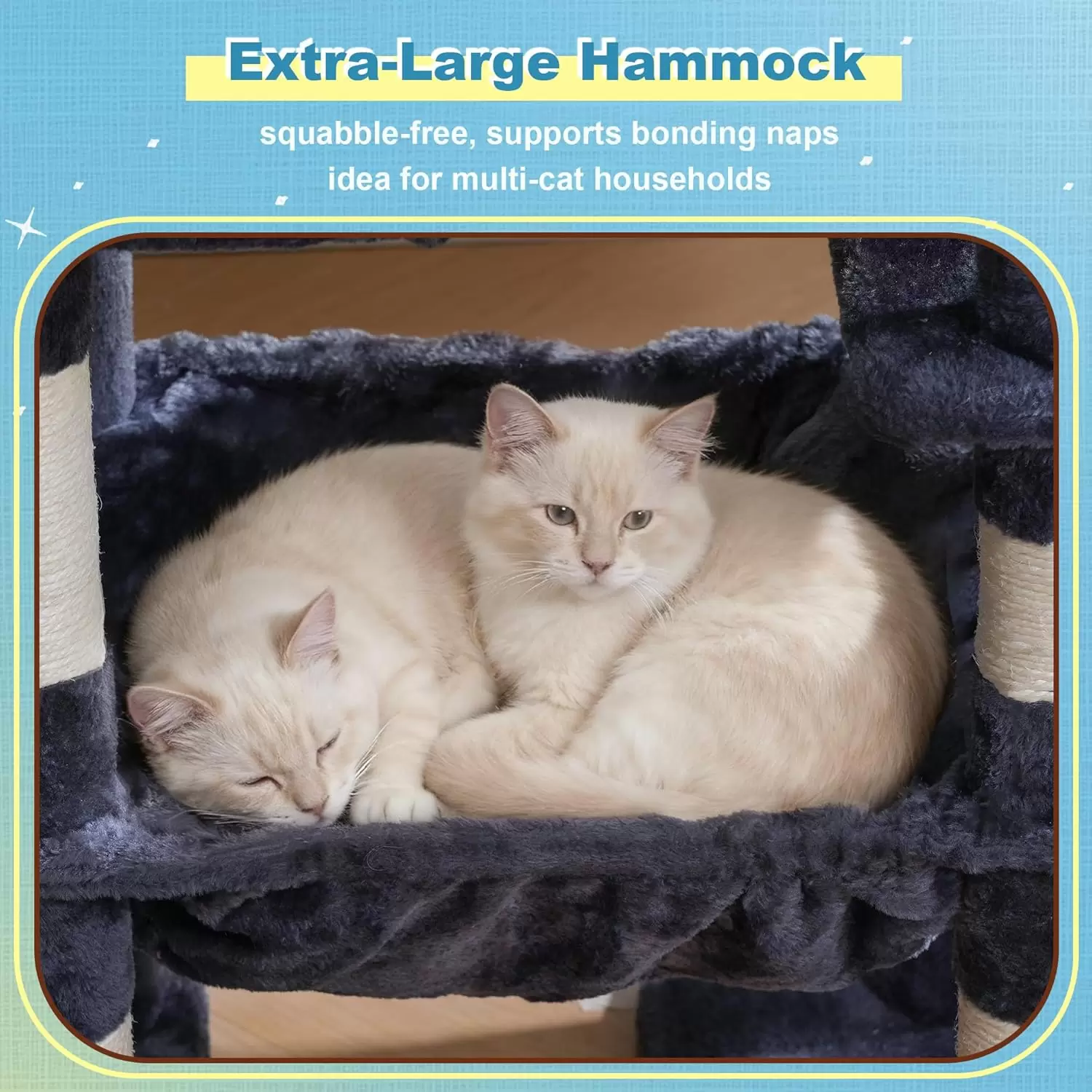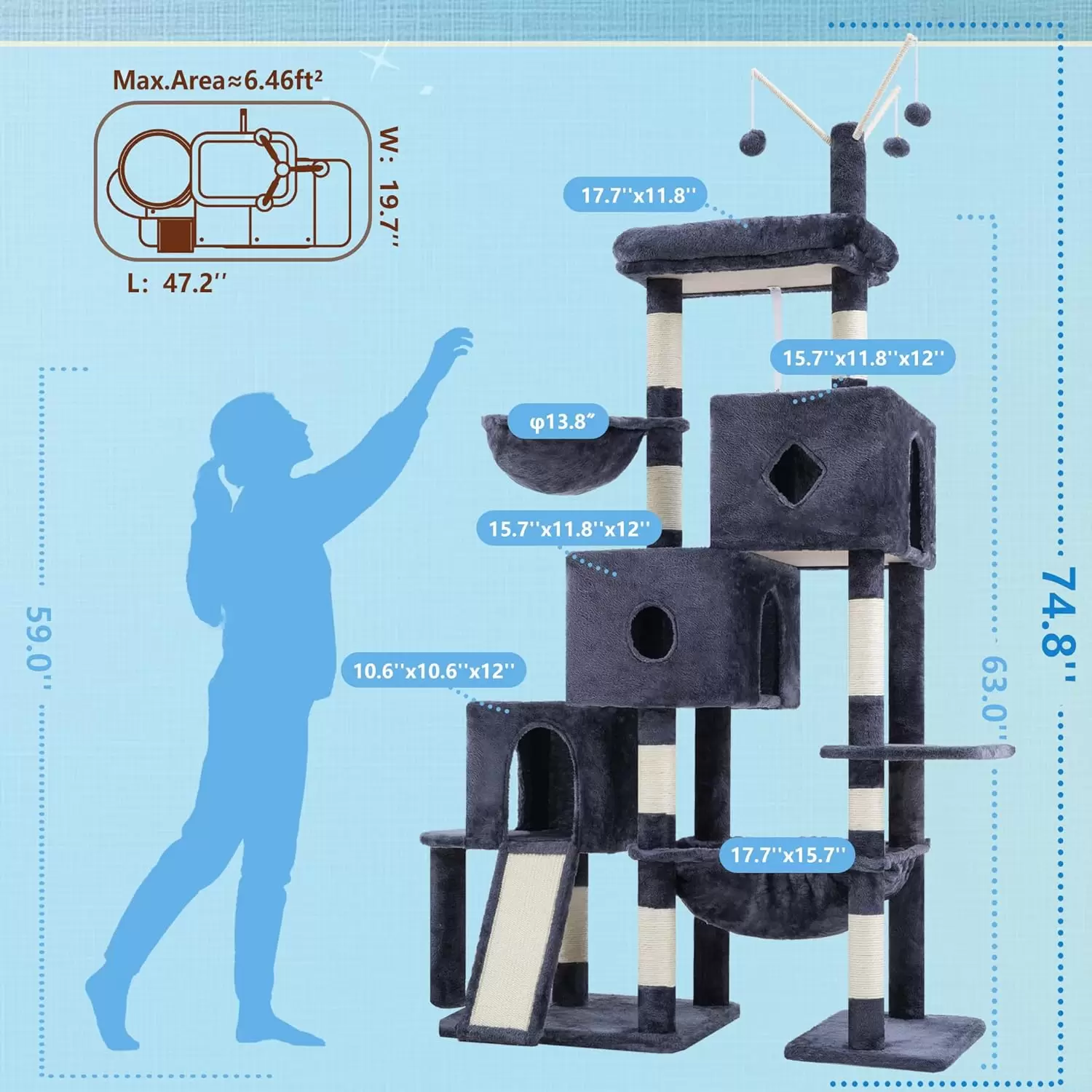 Zonas Abundantes: Este mueble incluye 3 acogedores condominios, una cama espaciosa, una hamaca de felpa y una canasta de gran tamaño.