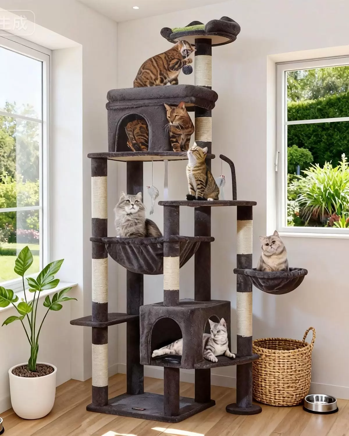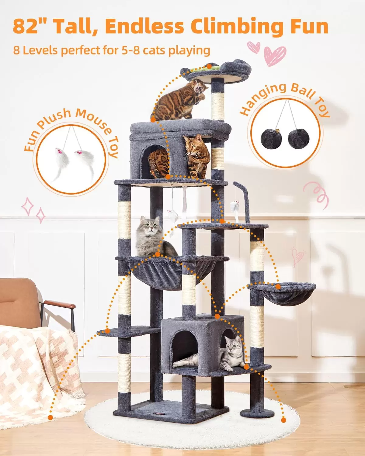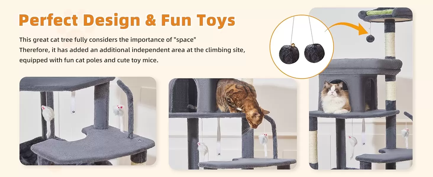 Montaje Rápido: Entendemos que su tiempo es precioso. Esta gran torre adopta una estructura de montaje simple con instrucciones detalladas, permitiendo que complete rápidamente el armado y construya un hogar feliz para su gato.