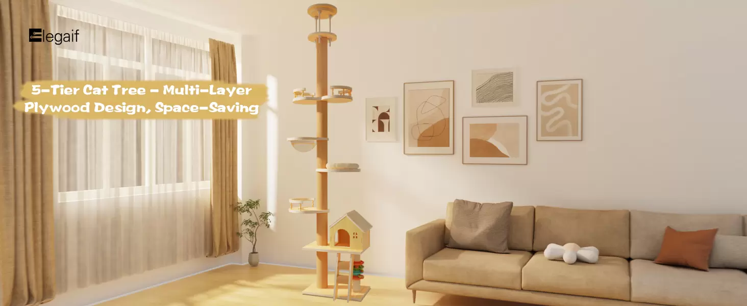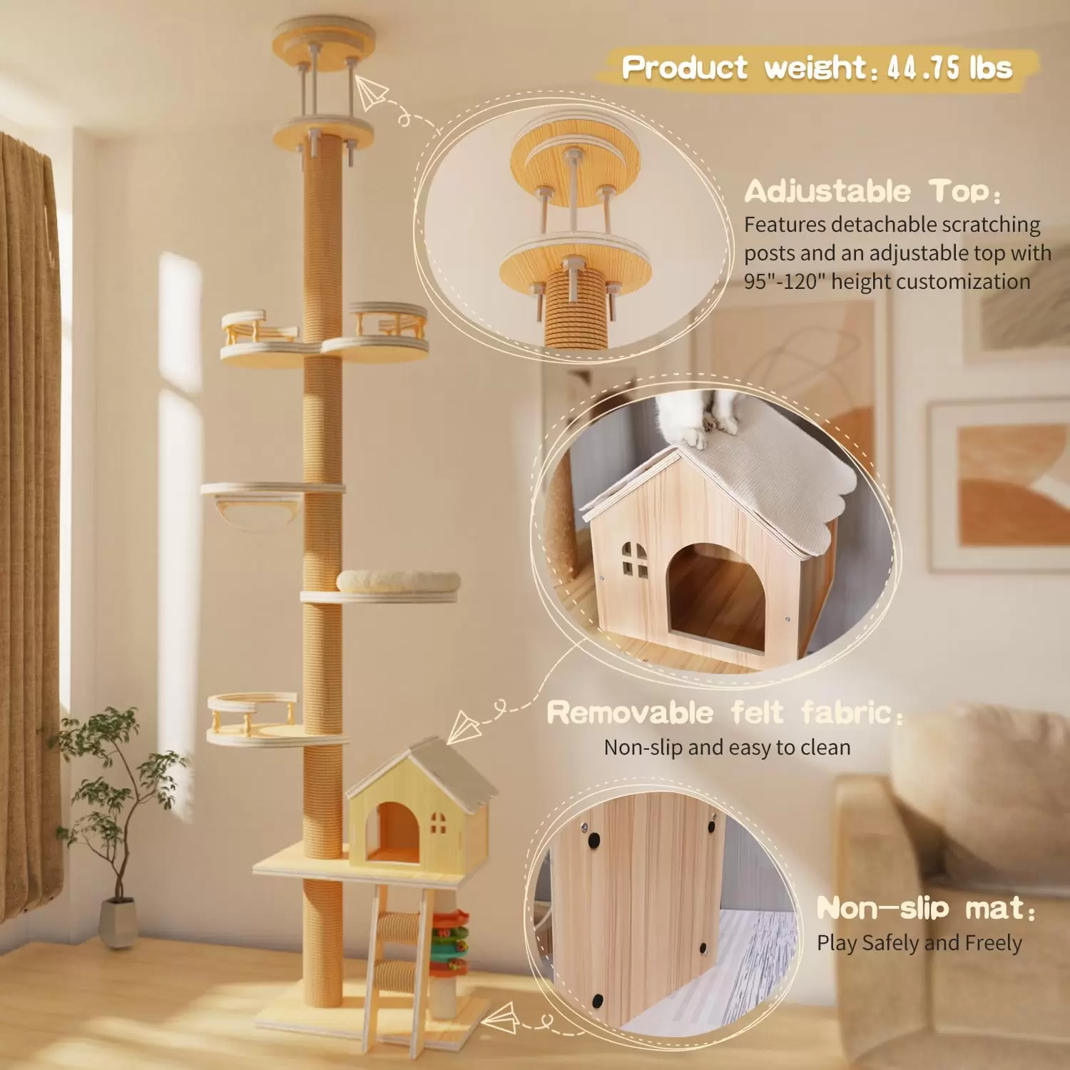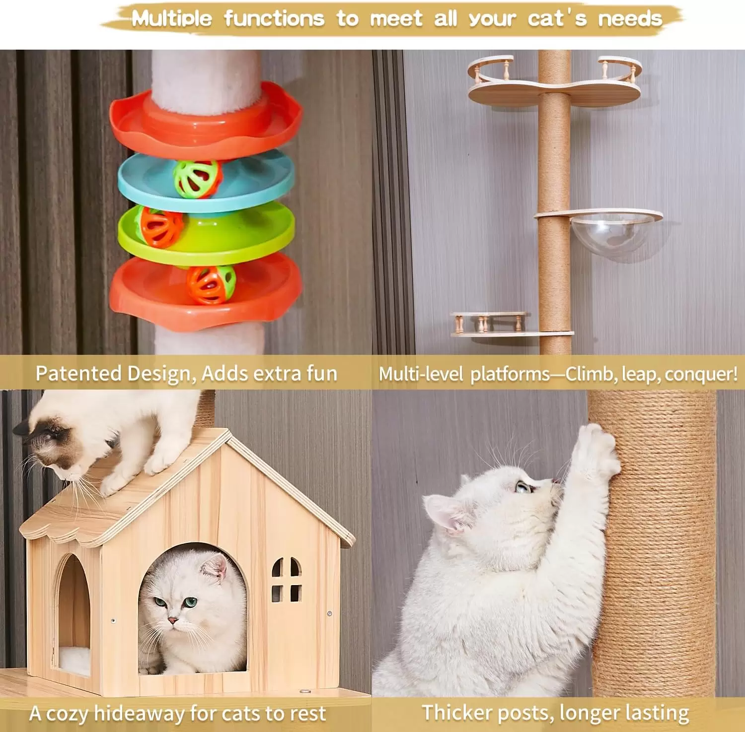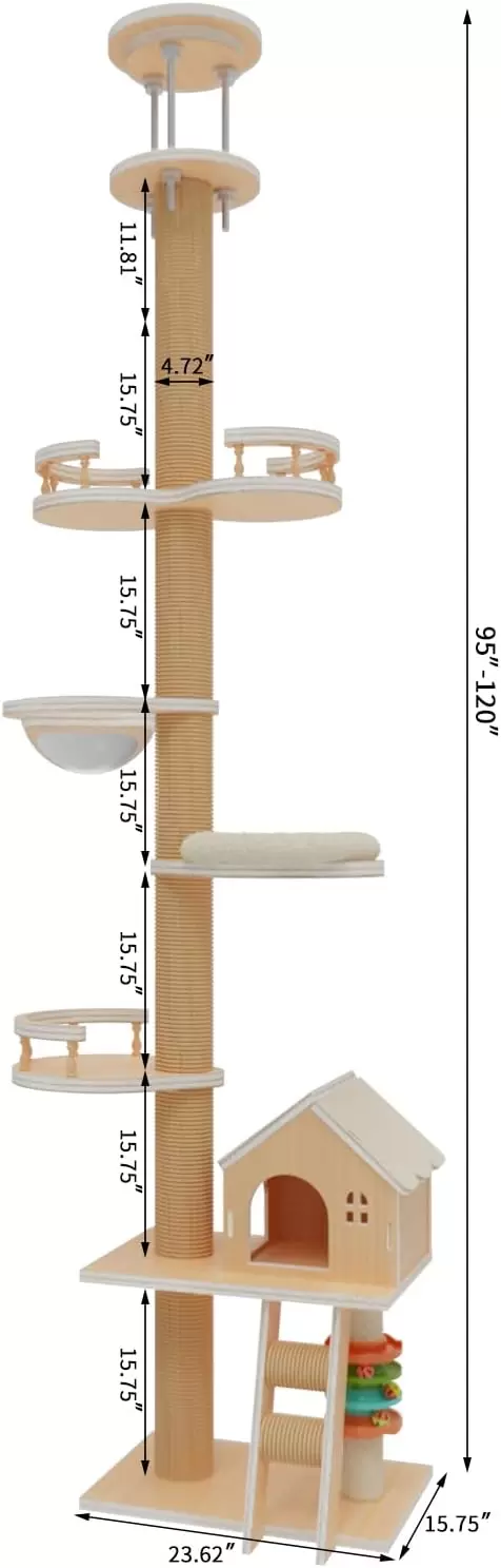 Diseño Ajustable y Ahorro de Espacio: Ajuste Flexible: Se ajusta de 241 centímetros a 305 centímetros (95 a 120 pulgadas) con herramientas básicas, adaptándose a cualquier techo en minutos. Vertical y Compacto: Su base delgada (60 por 40 centímetros) ocupa menos espacio que una mesita de noche, permitiendo a su gato trepar y supervisar desde arriba.