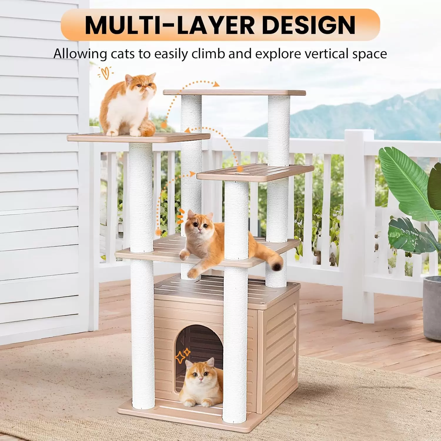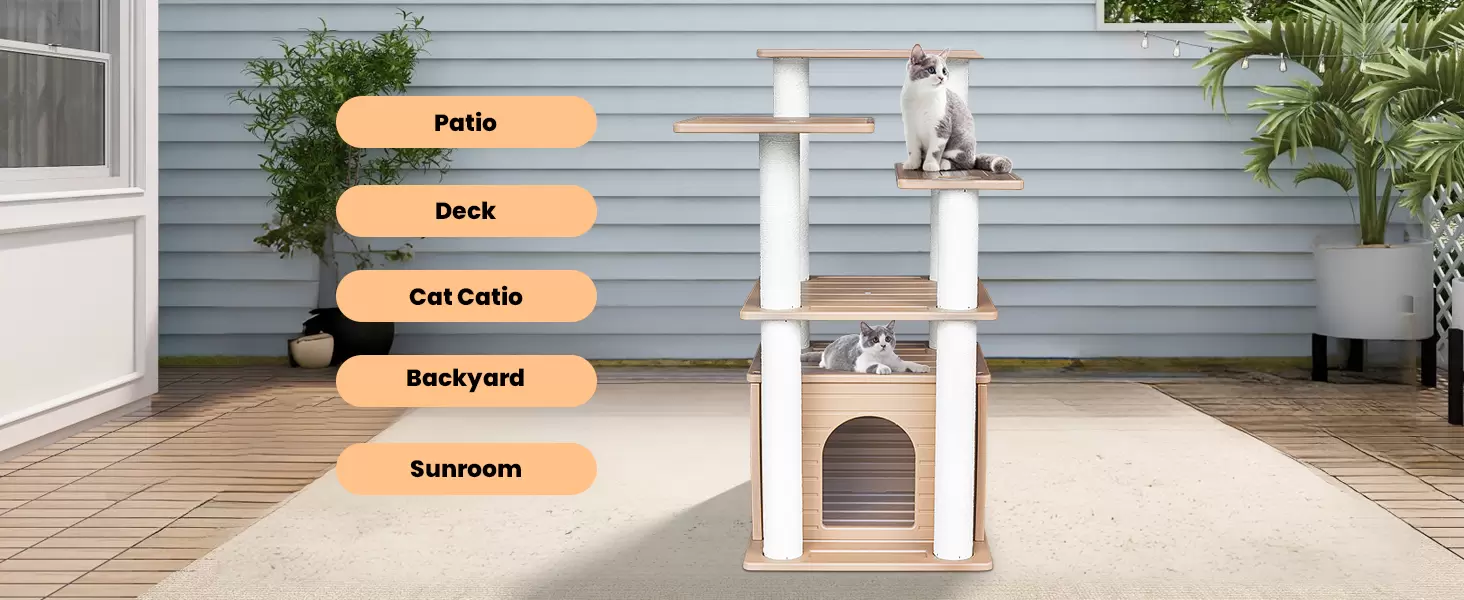 Ahorro de Espacio y Diseño Vertical: Forma Compacta: Su forma vertical ocupa menos espacio en el suelo. Máximo Espacio: Su gato puede estirarse en la espaciosa percha o acurrucarse en la casa para descansar.