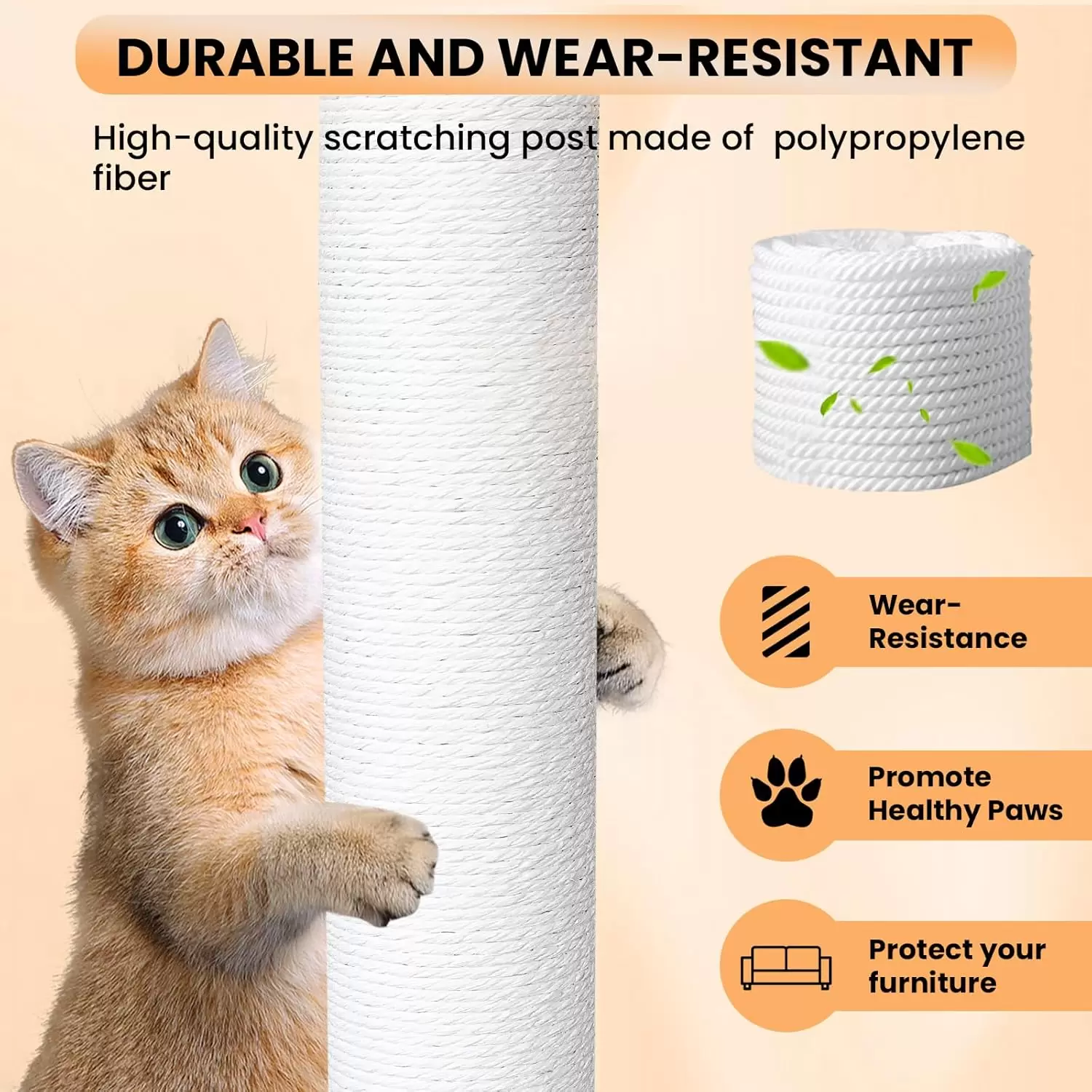 Durabilidad, Resistencia al Desgaste y Juego: Poste Rascador: La fibra de polipropileno es resistente al desgaste y a los arañazos. Estructura Confiable: Su diseño multicapa permite a los gatos trepar y explorar fácilmente.