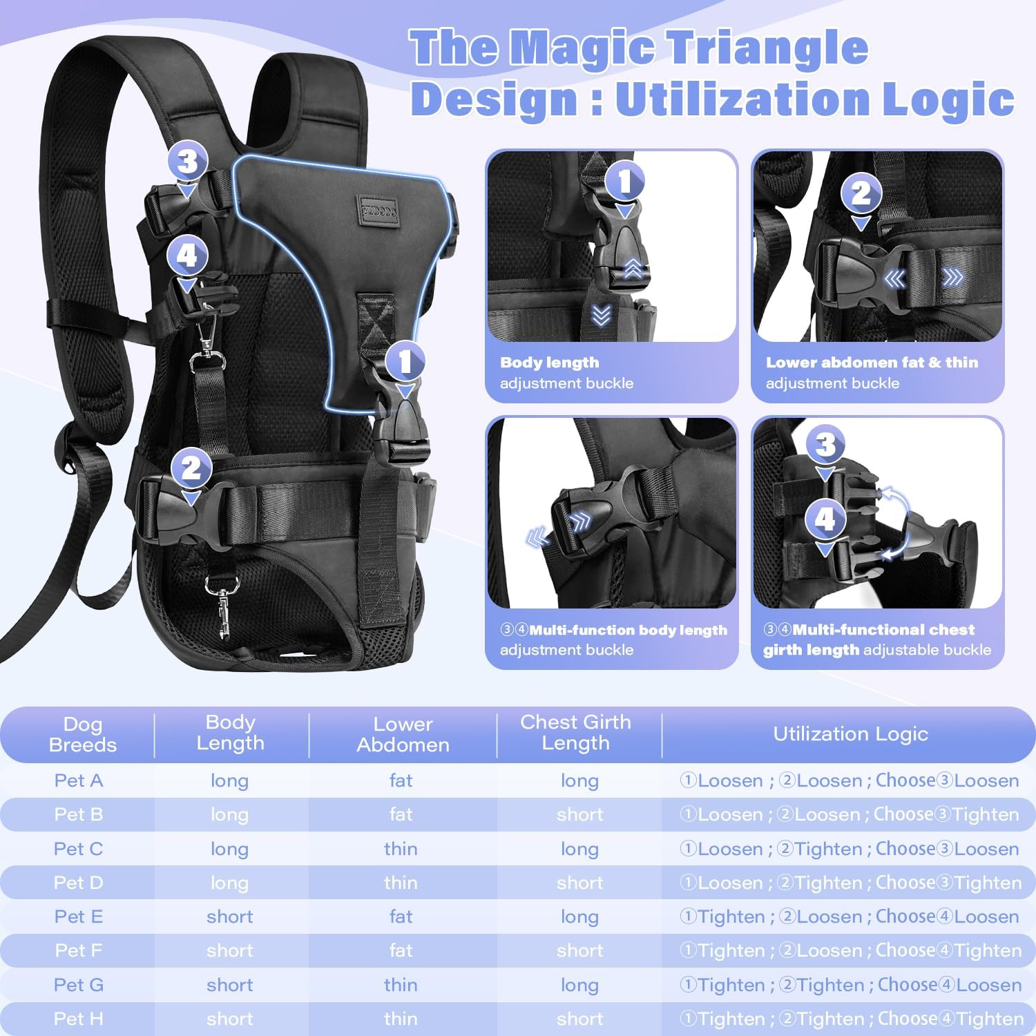 Comodidad y seguridad: la malla suave y el forro de algodón perla proporcionan comodidad para tu mascota. La “forma triangular” especialmente diseñada en el pecho ofrece un mejor apoyo, evitando la inclinación hacia adelante y reduciendo la presión sobre la garganta. La correa para el pecho, el cinturón y la cuerda de seguridad están incluidos para mayor seguridad.