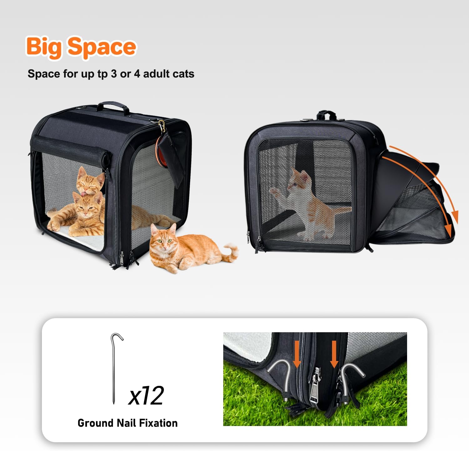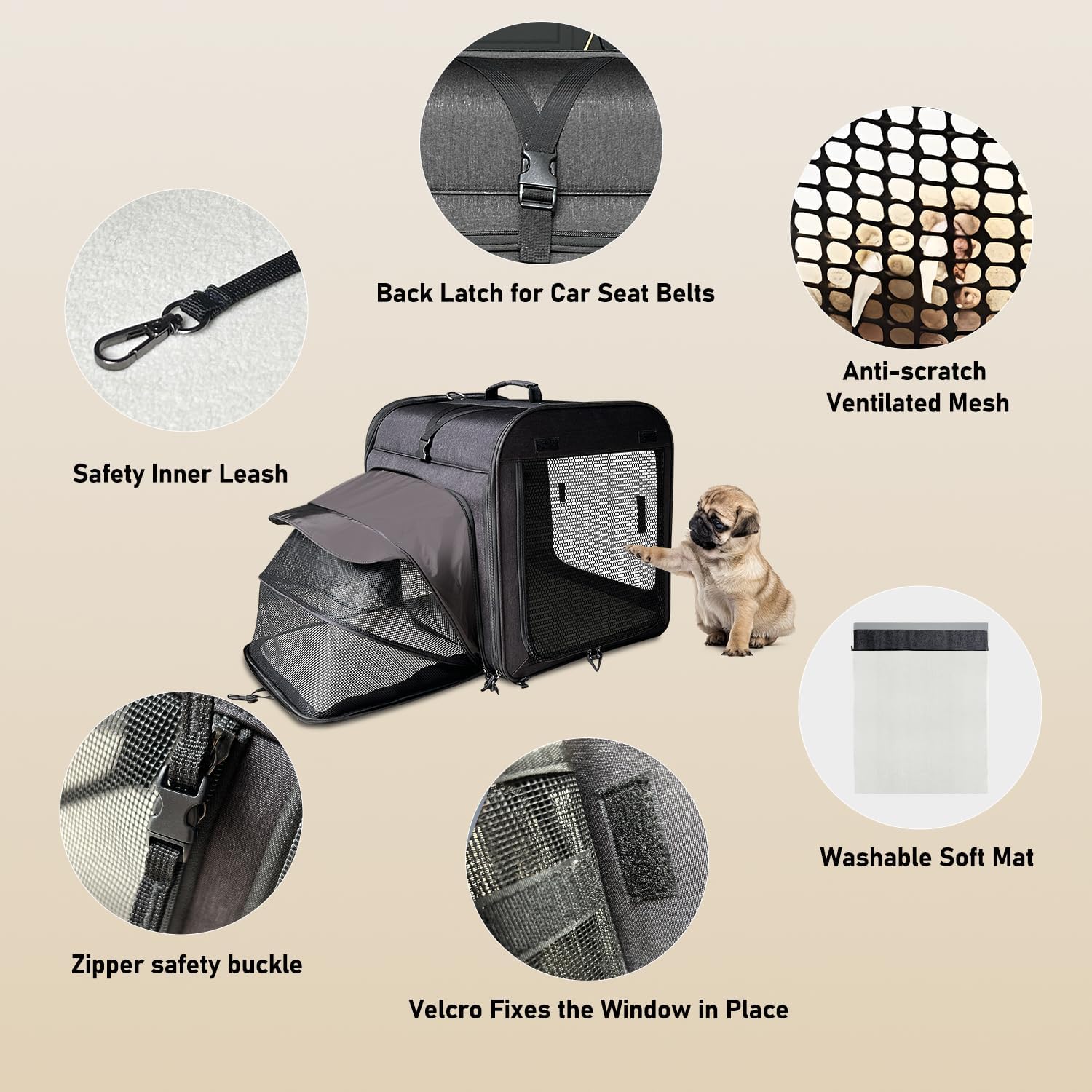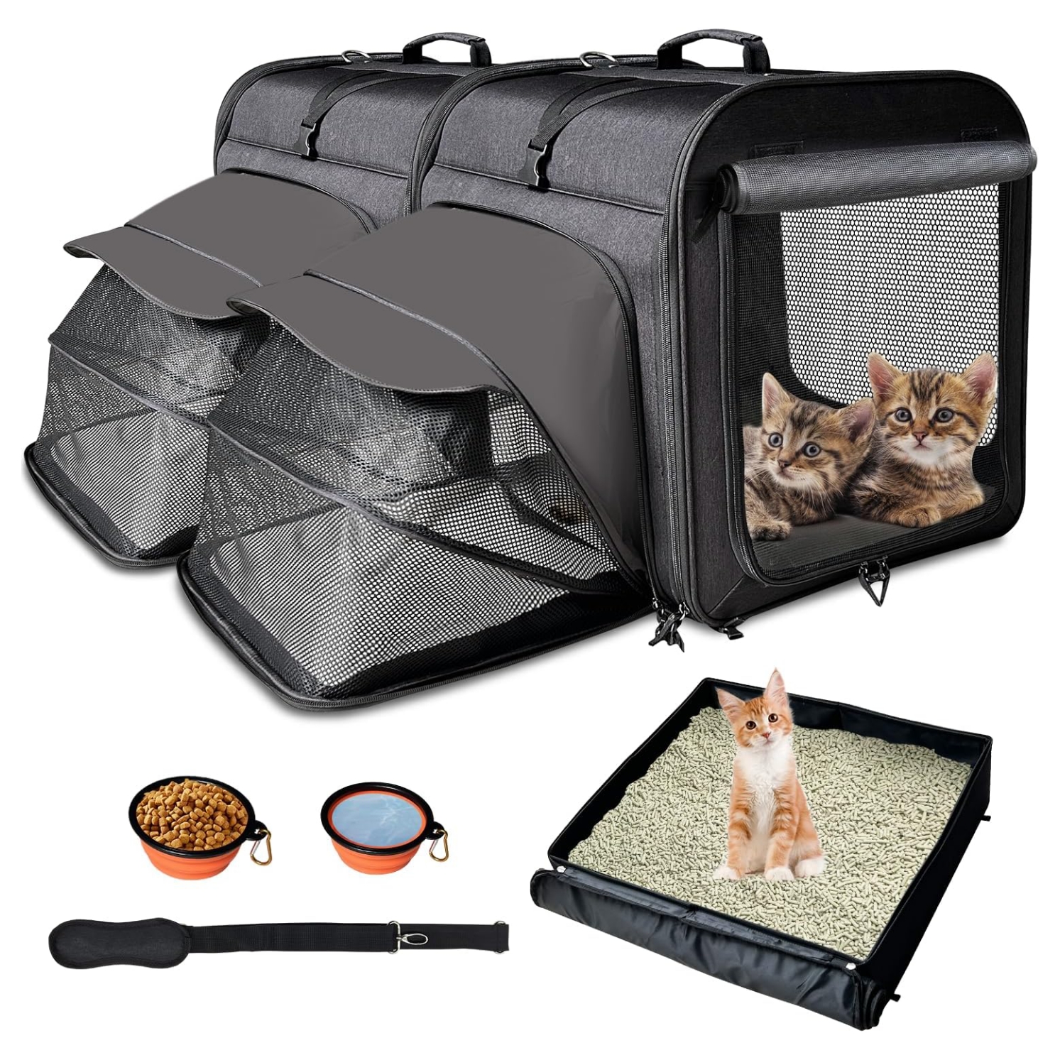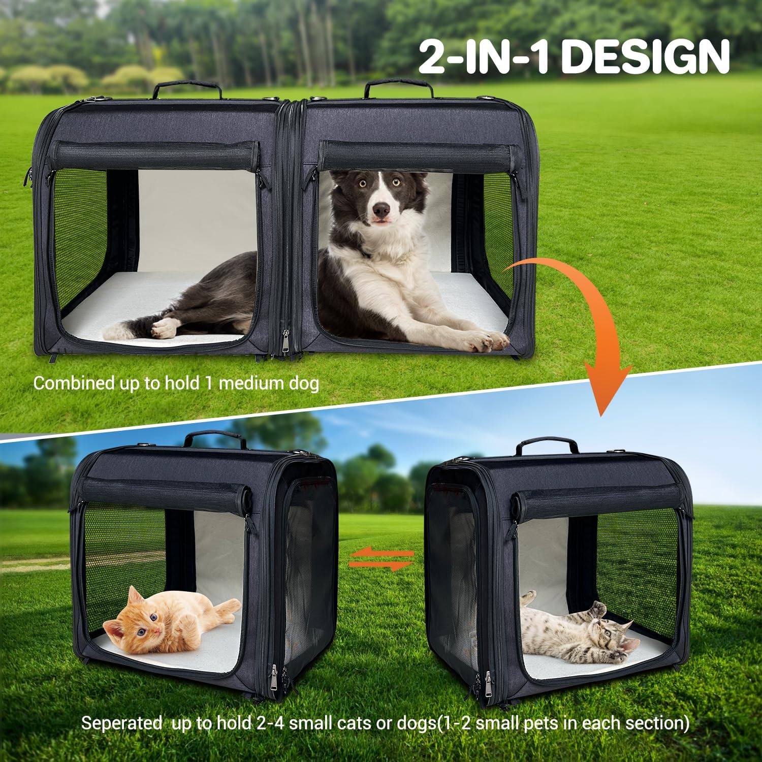 Espacio extragrande: transportador de viaje grande para mascotas perfecto para perros medianos o varios gatos. Tamaño individual: 18.5 x 18.5 x 22.5. Tamaño combinado: 37.4 x 18.2 x 22.5. El transportador para gatos de lados suaves se puede extender para proporcionar espacio adicional para que tus mascotas se muevan libremente.