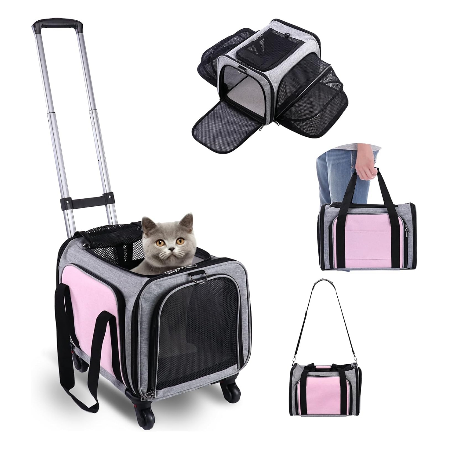 Transporte de mascotas sin estrés: el transportador para gatos es suave por lo que puede ser totalmente retráctil de material de alta calidad y ruedas giratorias y extraíbles de 360 grados que garantizan una movilidad suave, silenciosa y sin esfuerzo en cualquier dirección, lo que resulta en un paseo sin golpes para tu mascota.