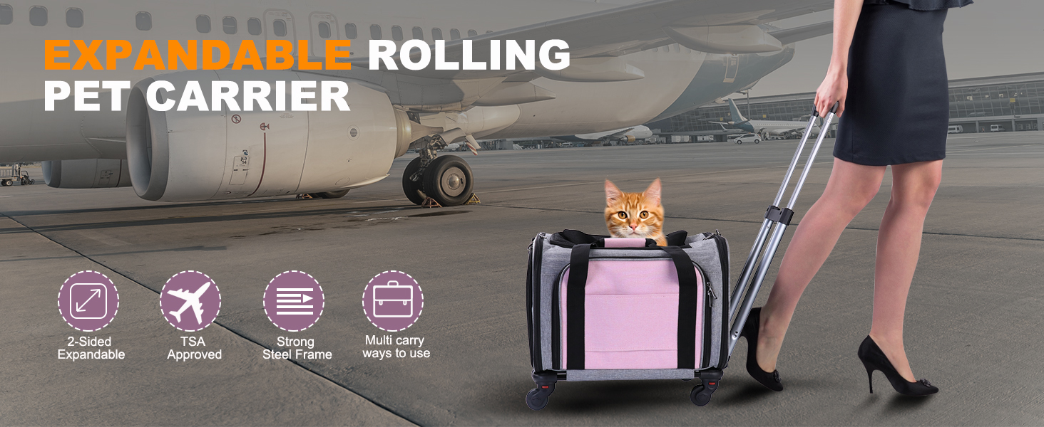 Expansión de dos caras: ambas paredes laterales se expanden en una extensión espaciosa, el espacio expandible permite que tu mascota se acueste y se relaje durante el viaje en automóvil y debajo del asiento del avión. Tus amigos peludos pueden estirarse durante el camino a los viajes. El transportador para gatos con ruedas es expandible hace que ambos animales estén cómodos, seguros y felices.