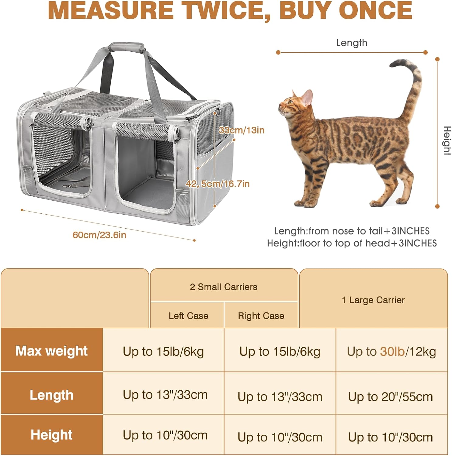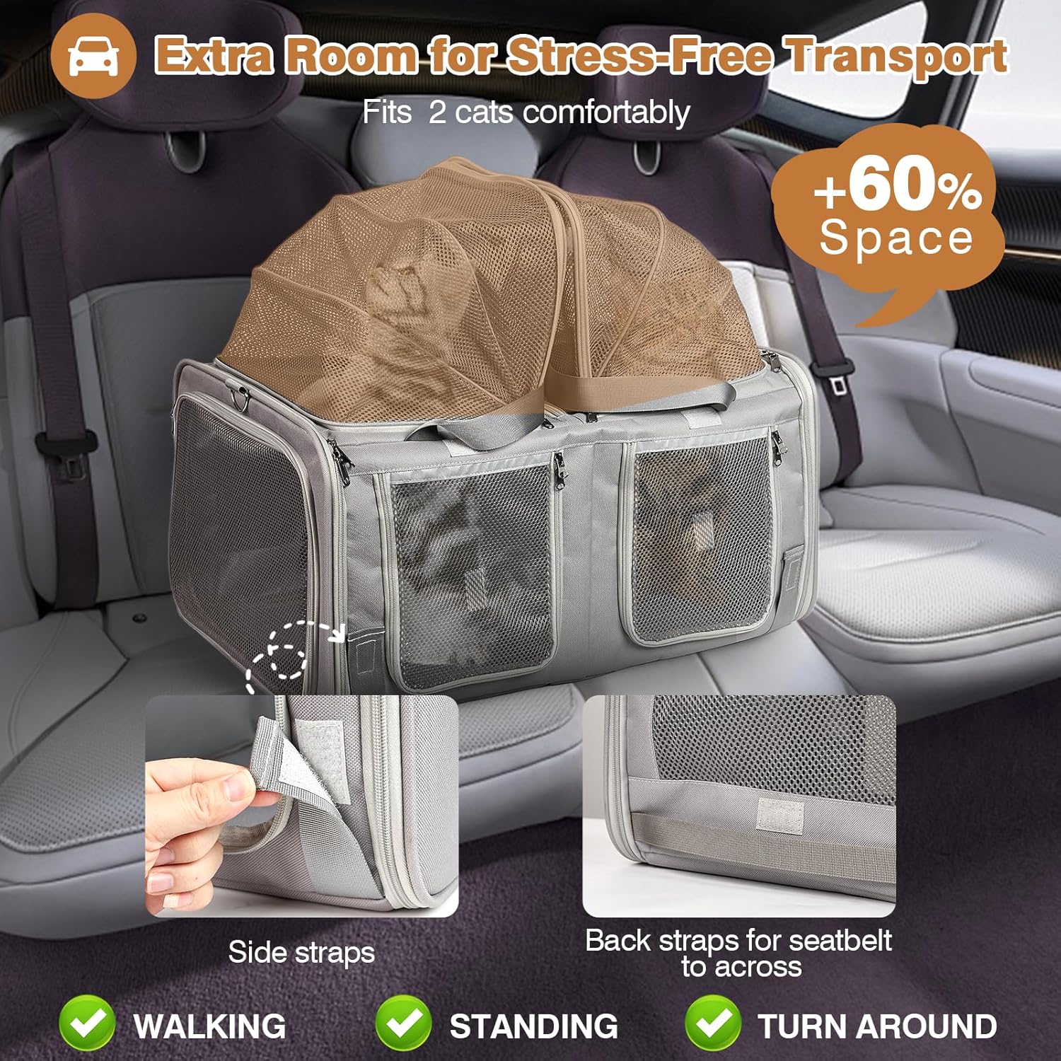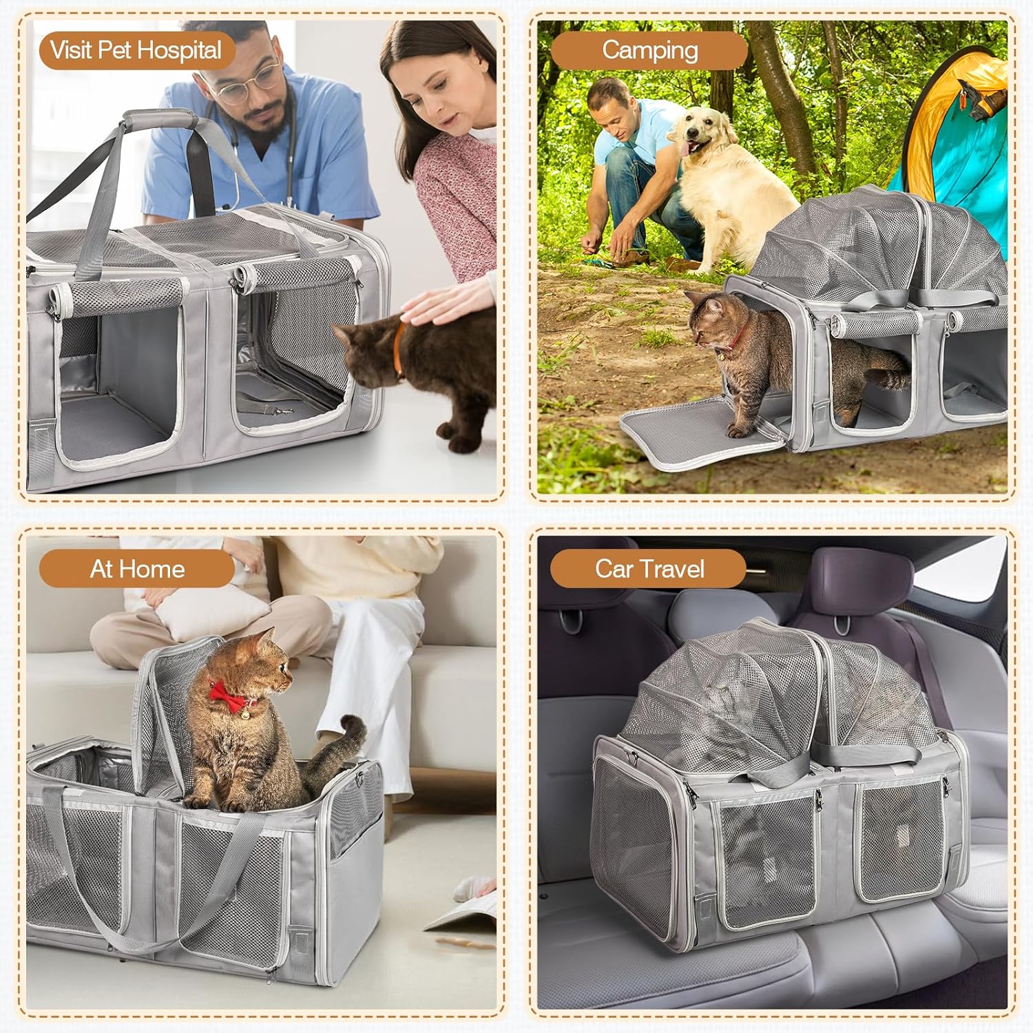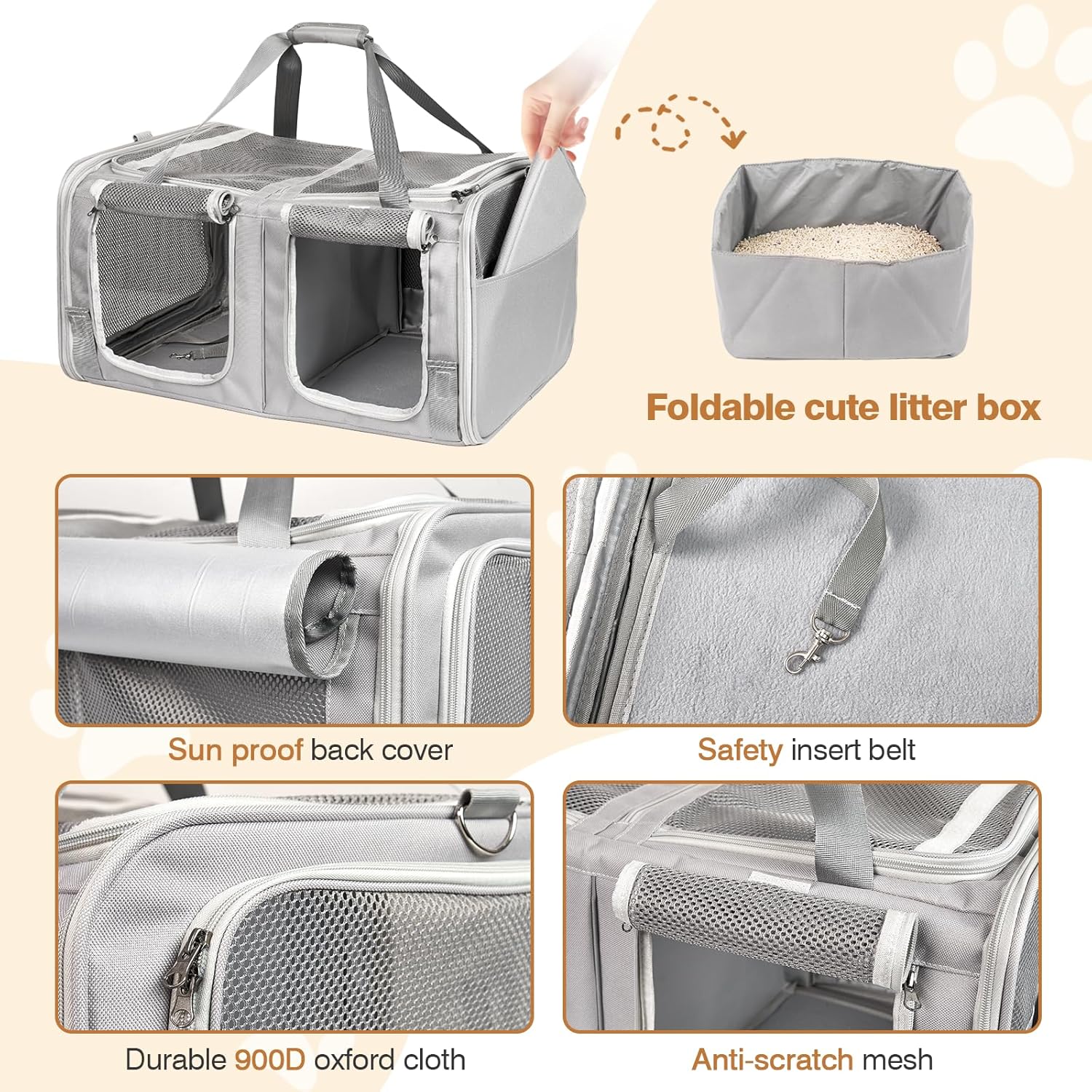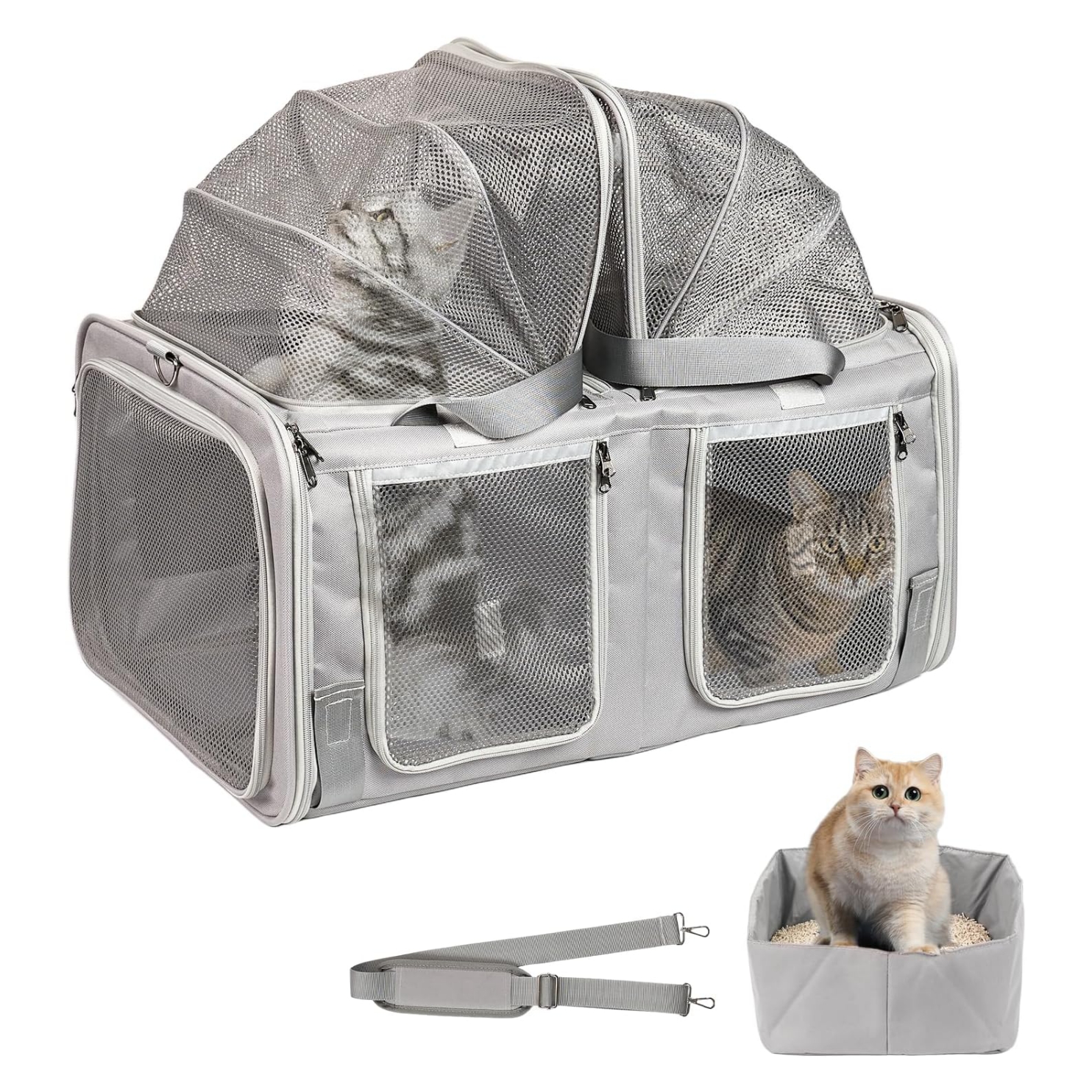 Portador para gatos de doble compartimento con caja de arena incorporada: diseñado para dos gatos adultos (hasta 15 libras cada uno), este transportador de mascotas expandible cuenta con compartimentos de expansión de acceso superior dobles (+8 pulgadas de altura) para viajes prolongados. Se pliega a 23.6 x 16.7 x 13 pulgadas para uso diario, se expande a 23.6 x 16.7 x 21 pulgadas cuando se necesita espacio adicional. Compartimento integrado para caja de arena que mantiene la higiene durante viajes de larga distancia