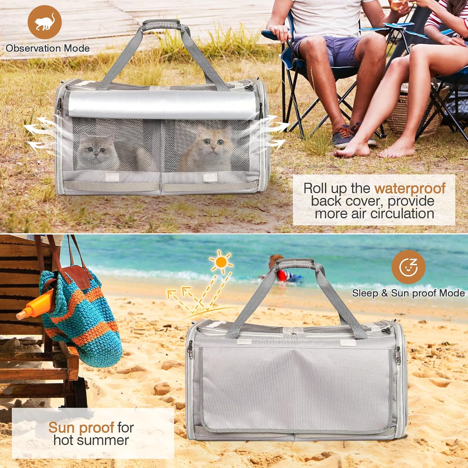 Diseño de tres aberturas y divisor central extraíble: este transportador para gatos cuenta con dos aberturas delanteras y una abertura lateral. La apertura lateral no solo facilita la extracción de la caja de arena, sino que también proporciona un acceso conveniente para que tu gato entre y salga.