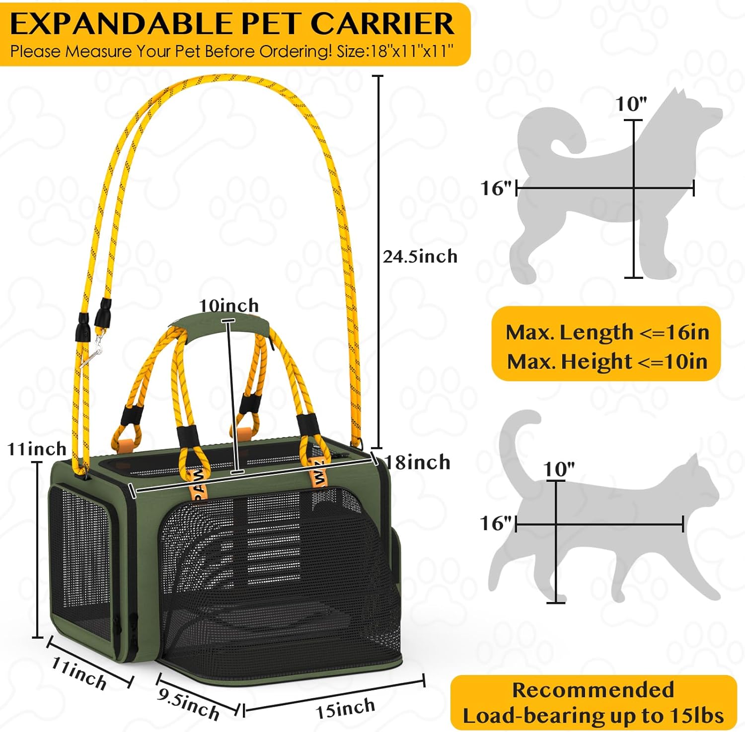 Duplica el espacio, duplica la comodidad: El diseño expandible del transportador de mascotas te permite abrir la parte delantera, proporcionando a tu mascota el doble de espacio para estirarse y relajarse. Ideal para dos gatos pequeños o grandes, conejos, perros pequeños y otros animales. El asiento inferior aprobado por aerolíneas para gatos de lados suaves mide 18 x 11 x 11 pulgadas