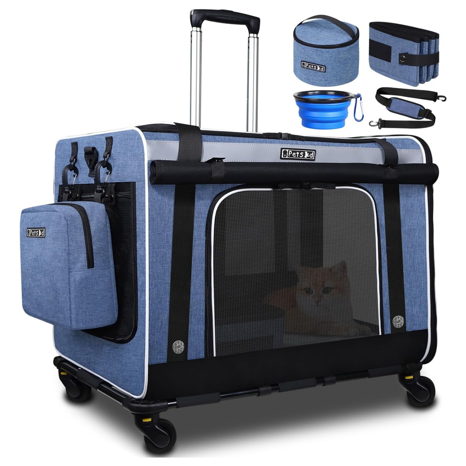 Ideal para Viajes en Auto: “Perfecto para viajes en automóvil: el transportador suave para gatos con ruedas es el mejor compañero de viaje para ti y tu mascota, el tamaño correcto y los anclajes de seguridad se pueden fijar bien en el asiento del automóvil mientras conduces, y la caja de arena de viaje de cortesía es el mejor inodoro portátil, el cuenco plegable también puede ser muy conveniente para alimentar sobre la marcha.”