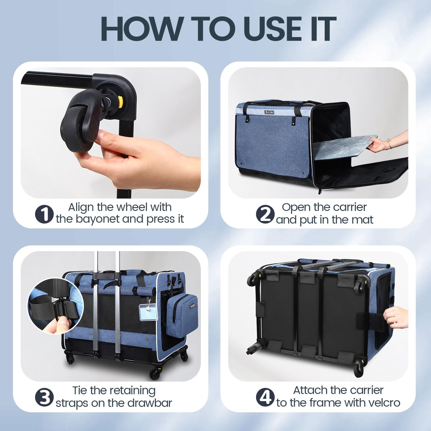 Movilidad sin Esfuerzo: “Ruedas de rotación de 360°: velcro en la parte inferior de las ruedas grandes para transportar mascotas y una correa en el mango hacen que sea fácil fijar la bolsa a las ruedas. Y cuatro ruedas de rotación de 360° pueden garantizar una experiencia de conducción suave y cómoda para el transportador de gatos rodante en superficies irregulares de carretera o césped.”