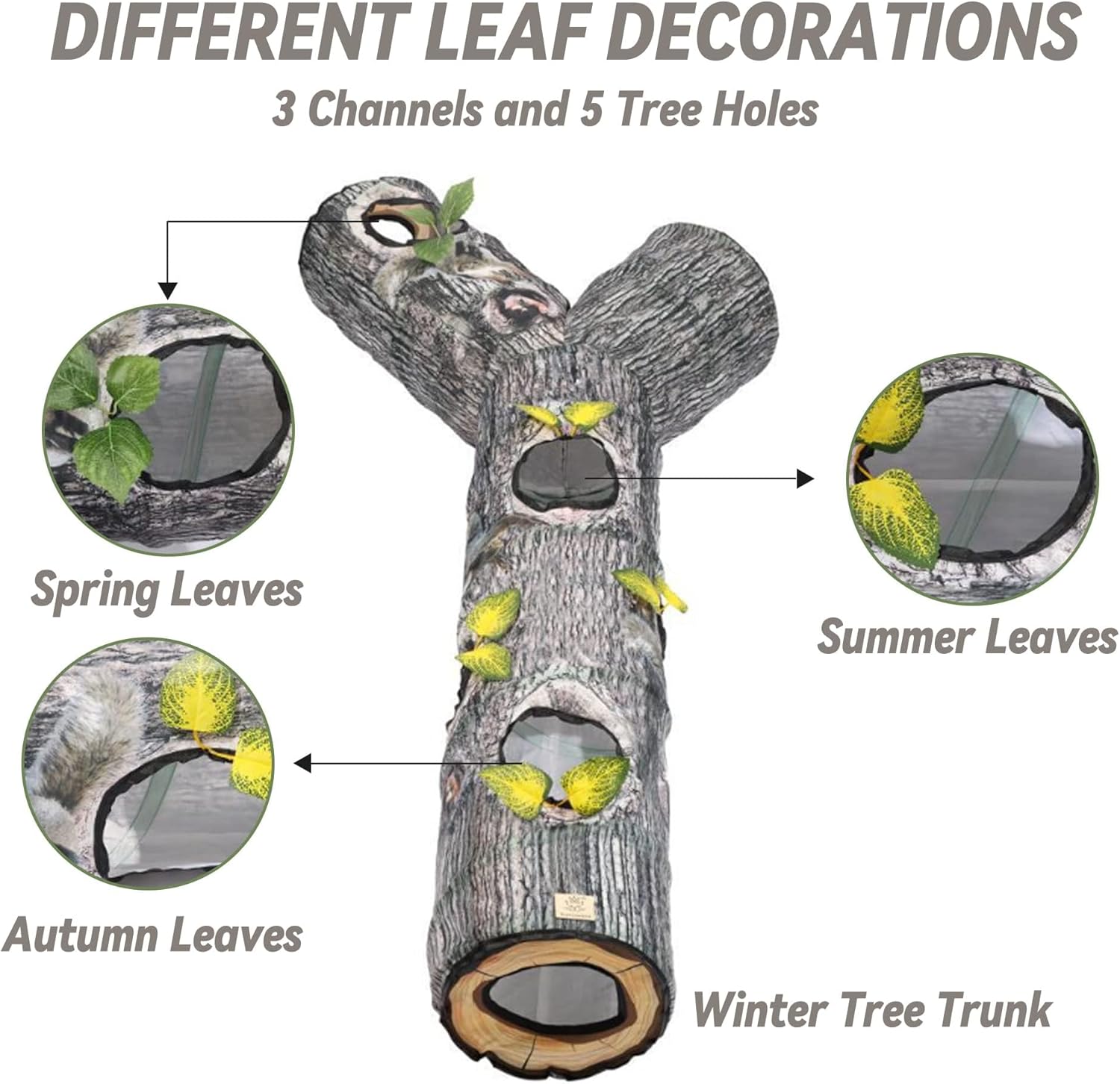 Concepto de diseño único: imita la textura de los árboles, decora hojas verdes, utiliza colores simulados de patrón de árbol para hacer que la visión general del producto sea más realista y hermosa, y el diseño a juego de agujeros y hojas de árboles hace que los gatos se sientan más reales y jueguen juegos de caza más locos.