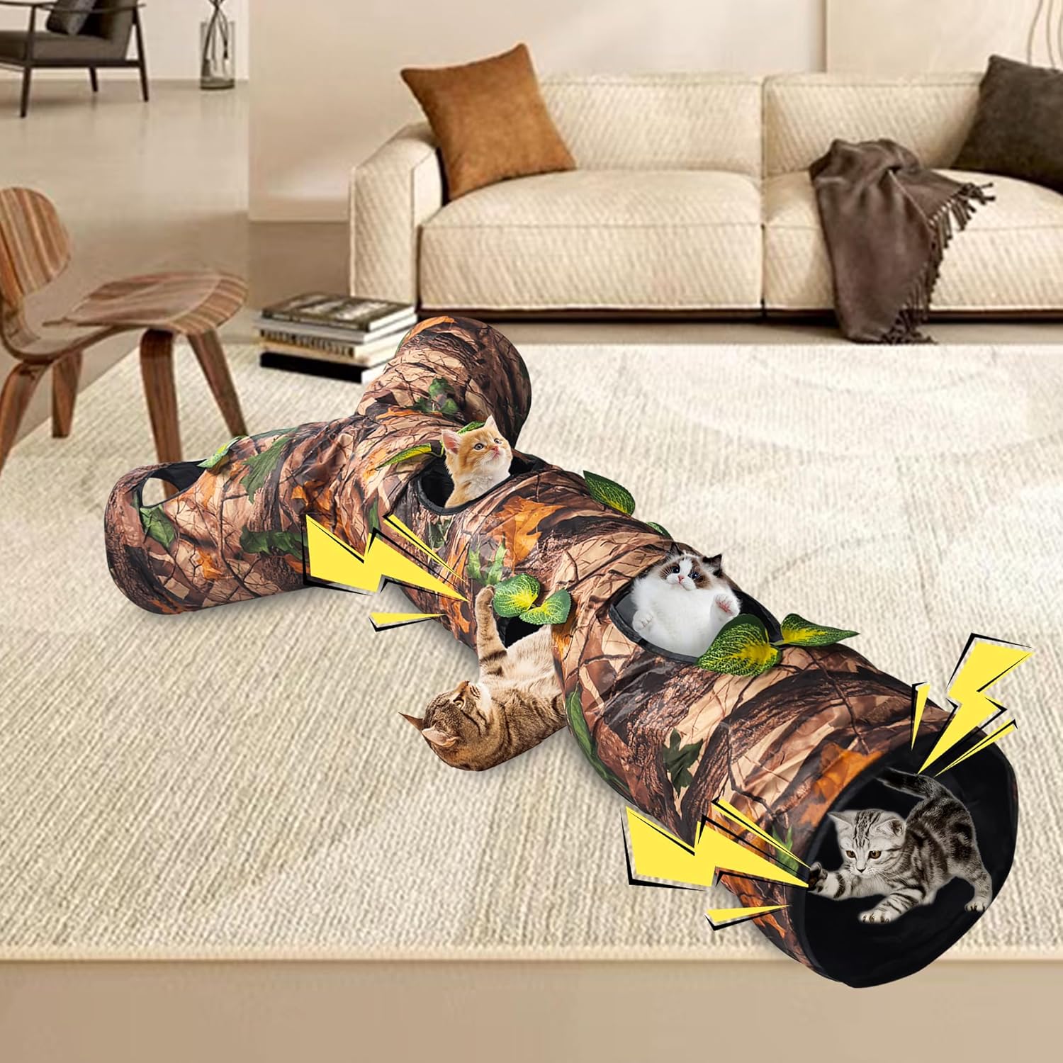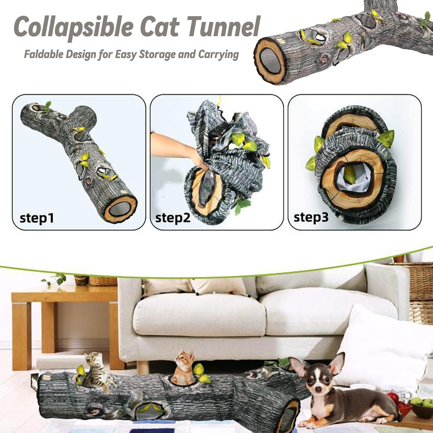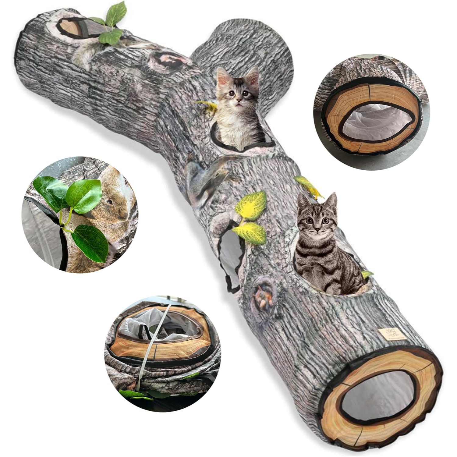 Juguetes locos para gatos: los túneles para gatos imitan los juguetes de tronco de árbol que hacen que los animales estén obsesionados y locos, el túnel para gatos está hecho de tela de poliéster de doble capa, no es fácil de romper, apoyado por un marco de acero de alta resistencia, con capa protectora en el extremo.